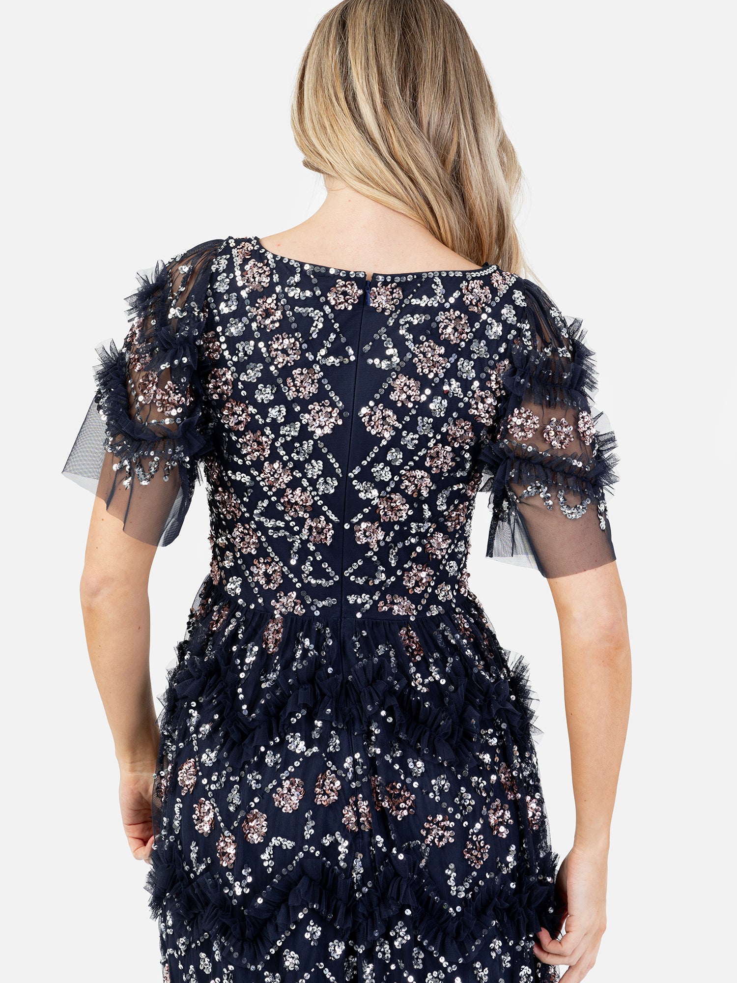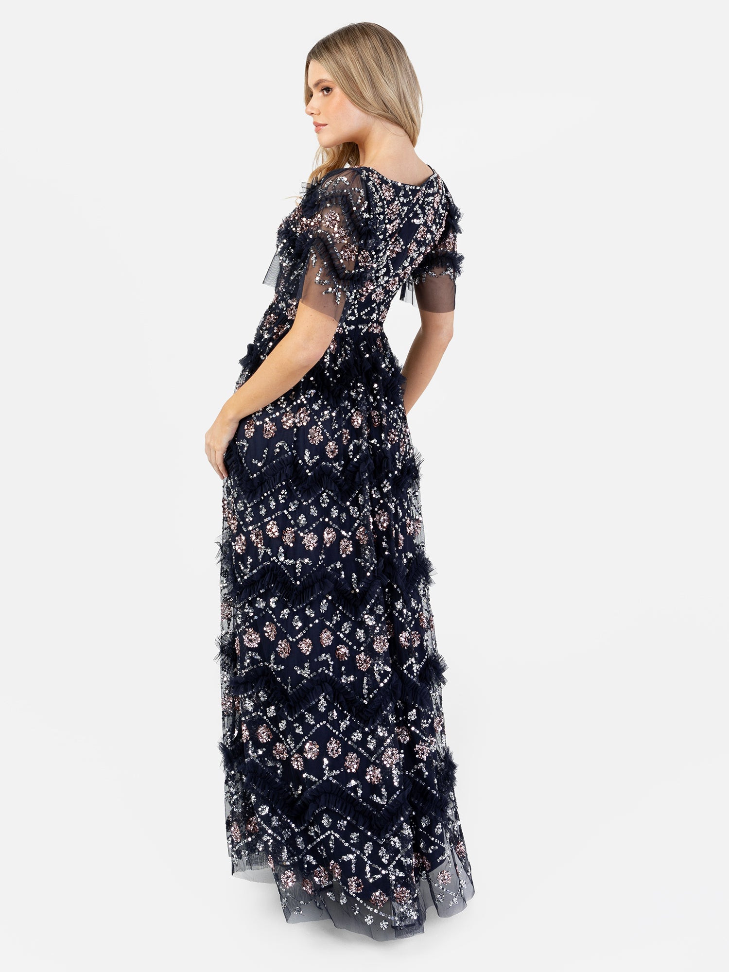 Maya Navy Fully Embellished Short Sleeve V Neck Ruffle Maxi Dress