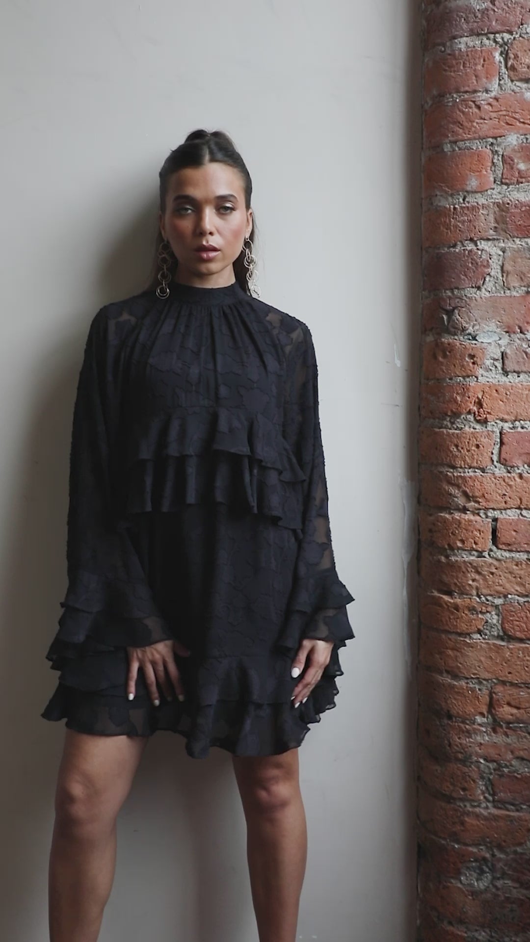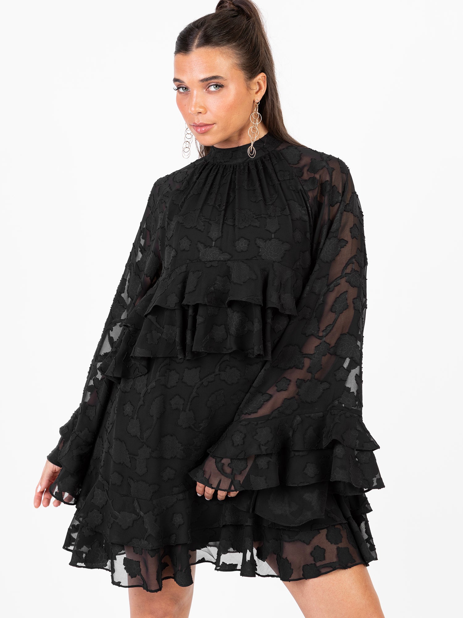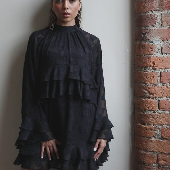 At Anaya with Love each item is consciously designed and made with 100% recycled fabric allowing you to embrace both style and sustainability. Effortlessly elegant with a touch of vintage charm, this mini dress is crafted from black floral burnout fabric that brings rich texture and subtle sheerness to the silhouette. The high neckline is secured with a delicate button-and-loop fastening, giving way to a softly gathered bodice and flared long sleeve that falls with ease. Ruffled tiers define the design, one placed just under the bust, the other accenting the hemline of the mini-length skirt, adding dimension and graceful movement. Designed in a relaxed shift silhouette, this dress offers a looser fit that flatters every body shape. Style with statement heels or boots to complete the look.