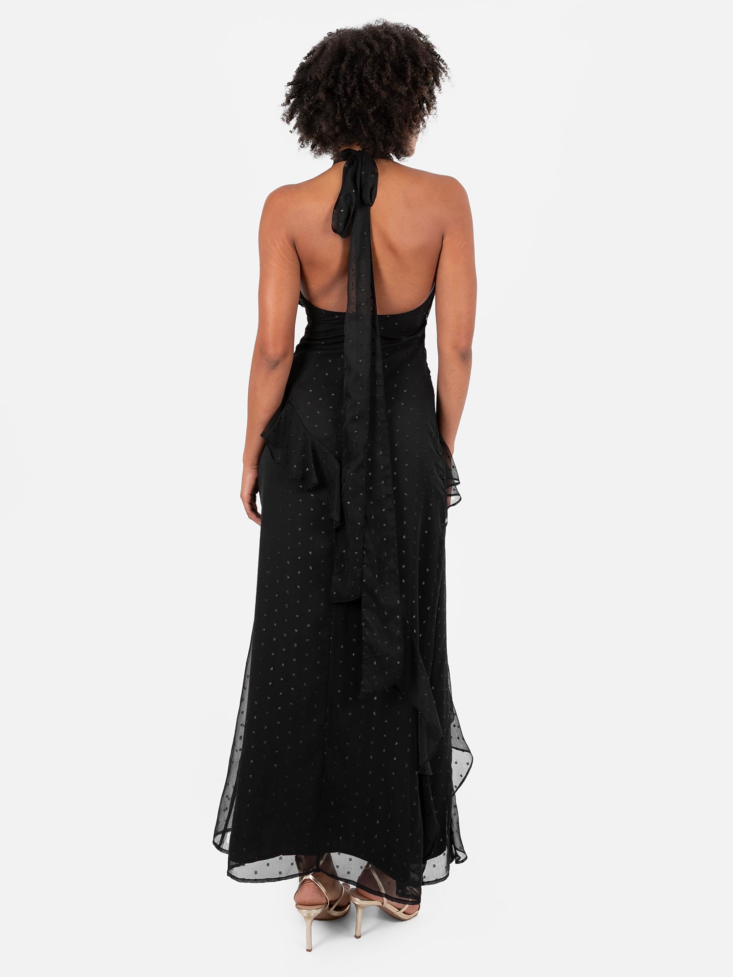 At Anaya with Love each item is consciously designed and made with 100% recycled fabric allowing you to embrace both style and sustainability. This maxi celebrates intricate textures and a timeless allure with its black metallic detailing and deep black hue. The self-tie halter neckline elevates the luxurious design, while the alluring open back ensures a striking impression from every angle. Diagonal ruffle layers, crafted from matching fabric, cascade from the neckline for added movement and drama. Designed to flatter, the silhouette features a subtle waist cinch and a graceful mermaid shape that effortlessly enhances your figure. Style this statement piece with barely-there heels, a sleek up-do, and silver accessories for a sophisticated yet sultry ensemble perfect for your next event.