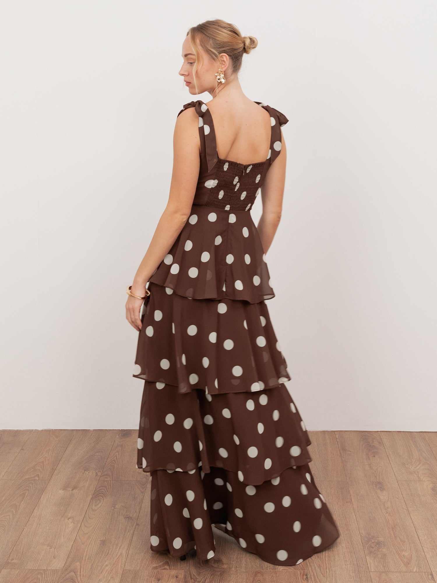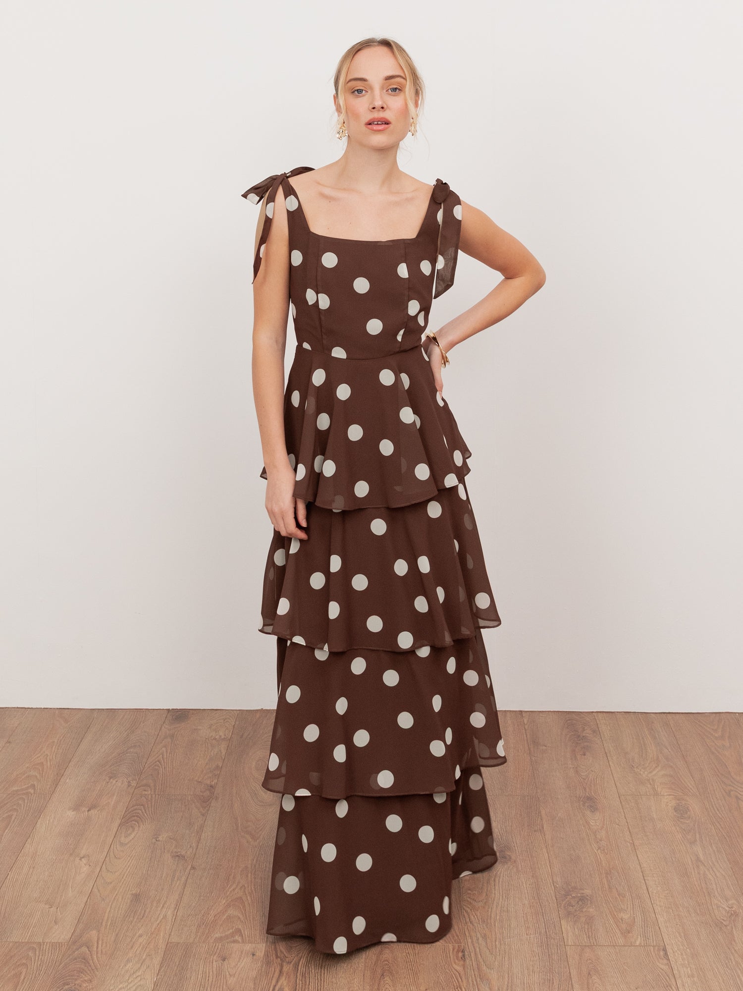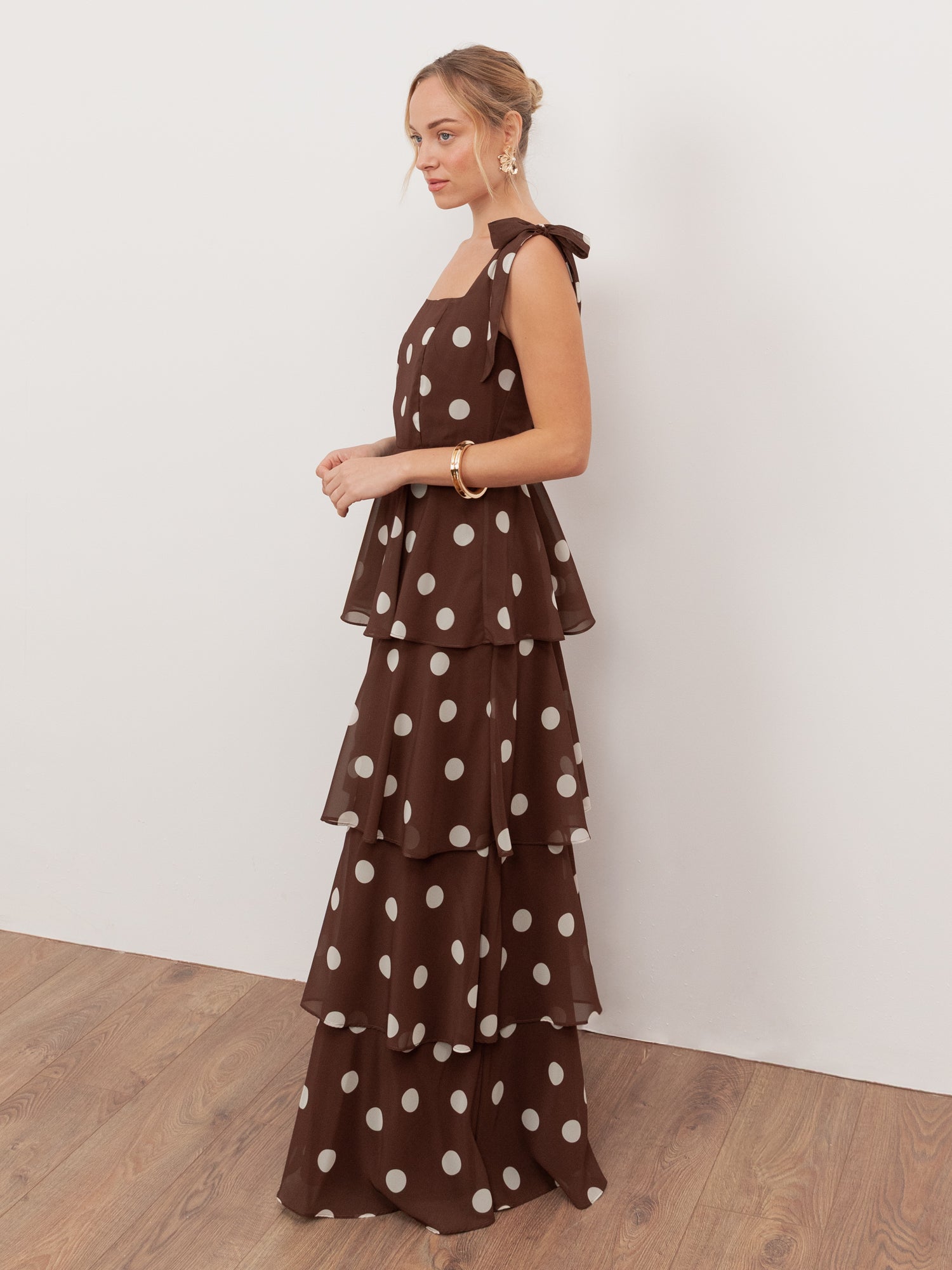 Anaya With Love Recycled Brown Polka Dot Tie-Shoulder Tiered Maxi Dress