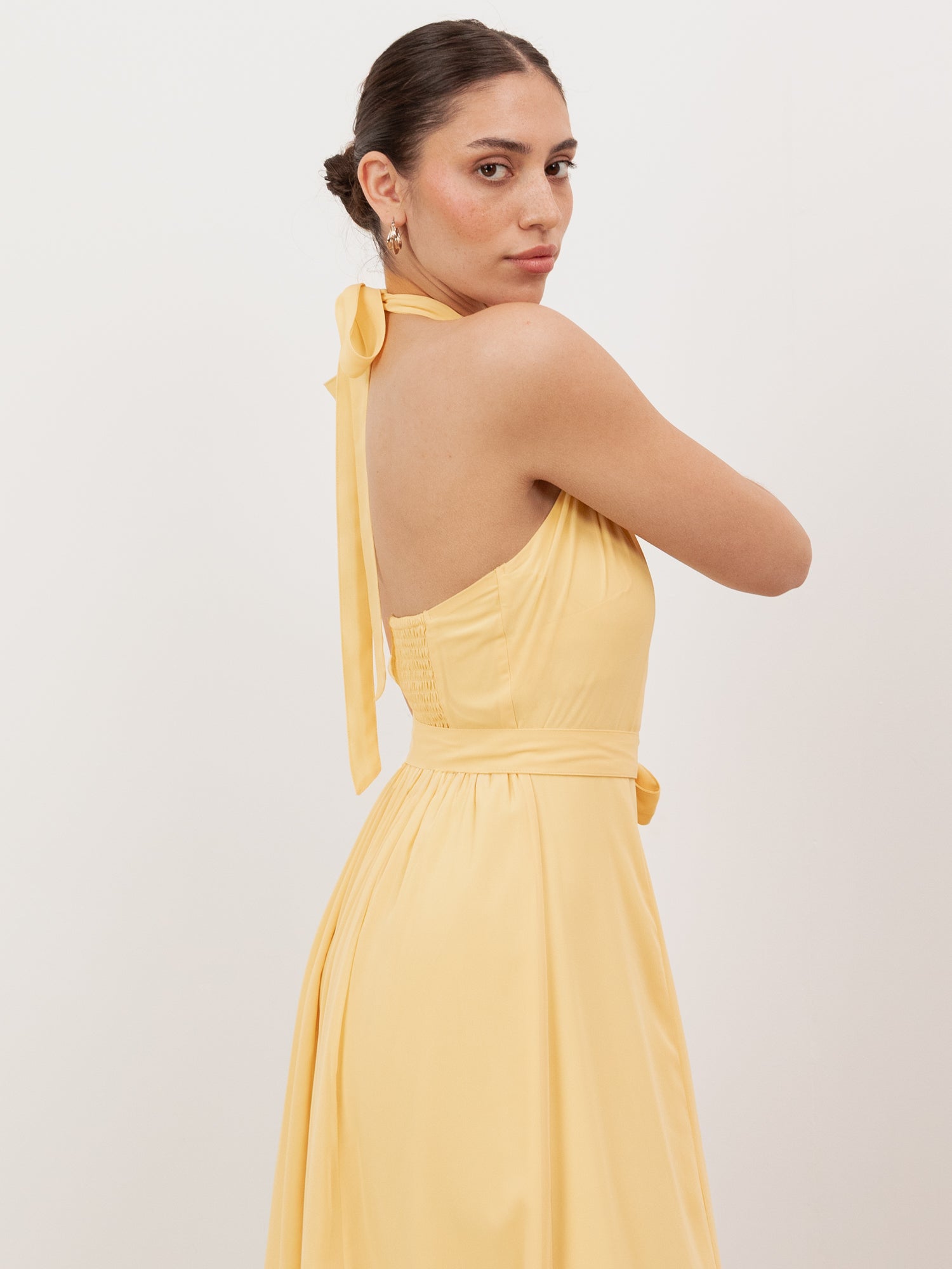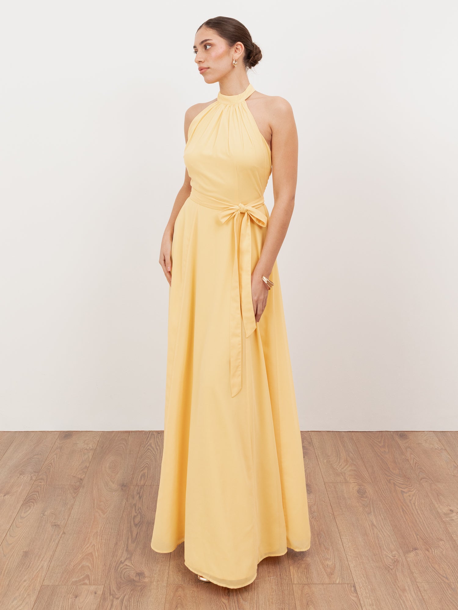 At Anaya with Love each item is consciously designed and made with 100% recycled fabric allowing you to embrace both style and sustainability. This dress is made for the most stylish occasions. Crafted from breathable georgette, the butter-yellow design is defined by a bold halter neckline that ties elegantly at the back. The sleeveless bodice softly gathered from the neckline adds depth, while the gently flared maxi skirt creates a flattering silhouette. For a bridesmaid-ready look, fasten the removable sash belt at the front and complete the ensemble with golden heels and delicate jewellery.