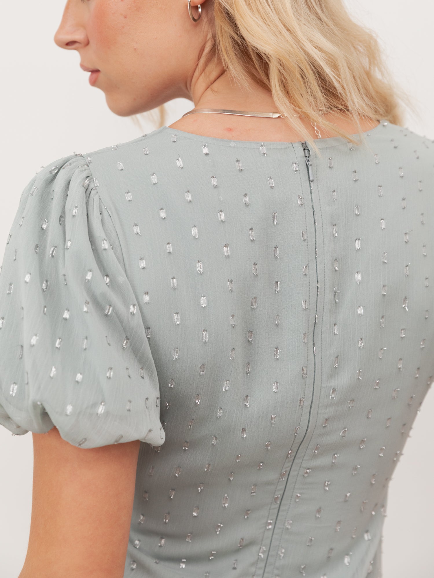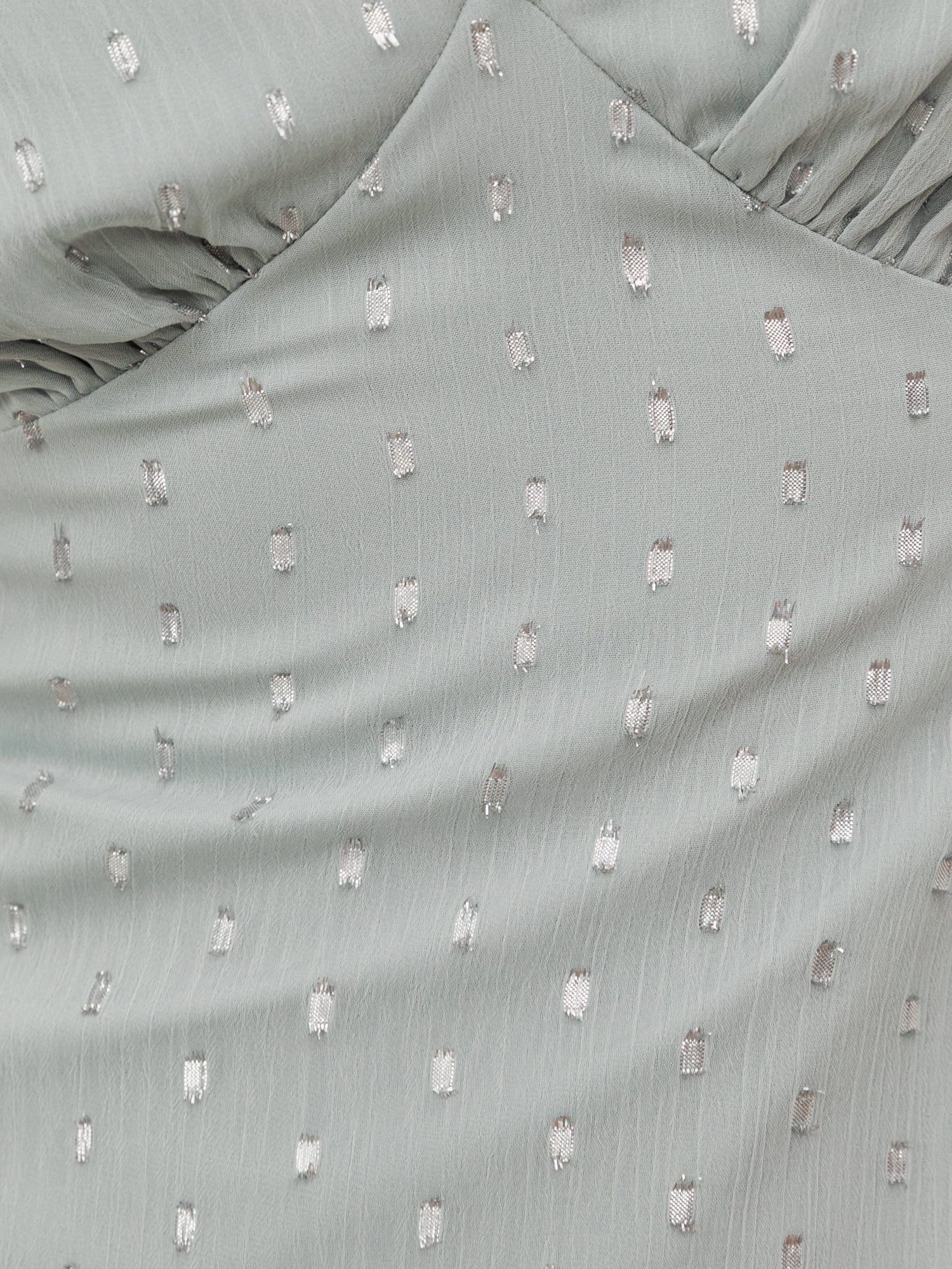 At Anaya with Love each item is consciously designed and made with 100% recycled fabric allowing you to embrace both style and sustainability. Expertly tailored from breathable chiffon in an elegant cloud-blue hue, this occasion piece is an ode to timeless sophistication, enhanced by all-over metallic detailing. The flattering V-neckline and softly ruched bust beautifully accentuate the empire-waist silhouette, while short puff sleeves add a delicate, feminine touch. The floor sweeping maxi skirt is artfully adorned with cascading waterfall ruffles, creating a sense of movement, while a daring thigh-high slit introduces an element of allure. Elevate the ensemble with silver-toned heels and shimmering jewellery for an effortlessly glamorous finish.