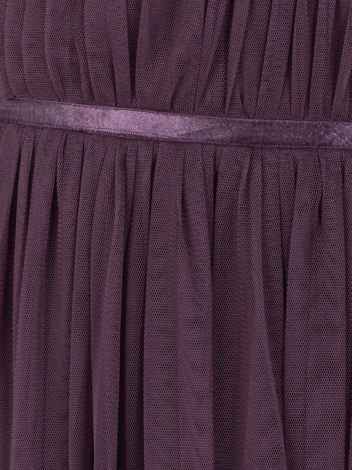 At Anaya with Love each item is consciously designed and made with 100% recycled fabric allowing you to embrace both style and sustainability. An effortlessly versatile piece tailored to complement any occasion but particularly ideal for the cherished role of bridesmaids. The bodice and midi skirt showcase a luxurious gathered tulle overlay offering a touch of ethereal charm while also embracing a romantic feel with layered sheer short sleeves. Delicate ribbon accents on the bodice not only define the waist and bust but also accentuate the A-line silhouette. Complete your look by pairing this purple midi dress with shimmering silver accessories and stylish strappy heels.