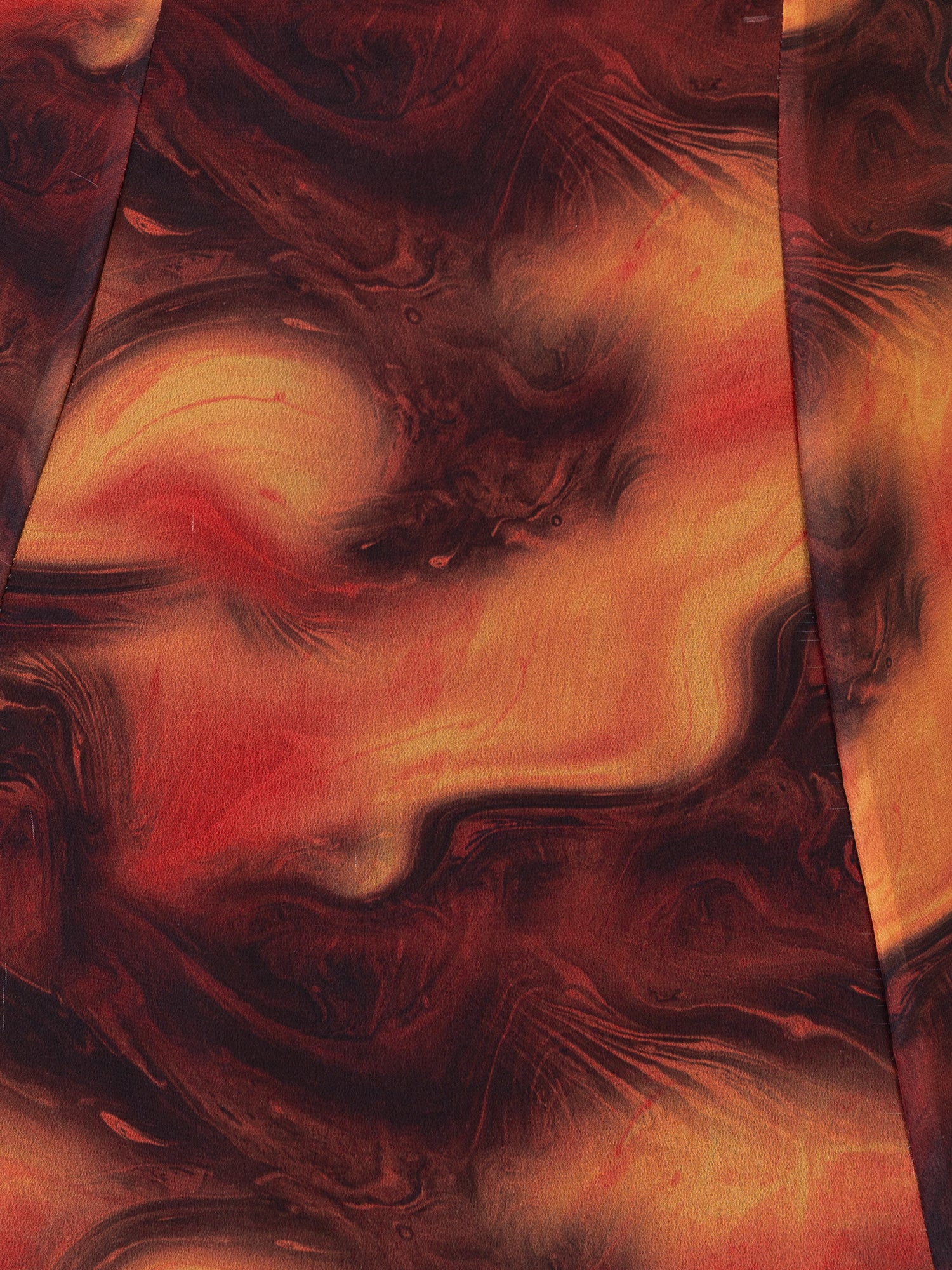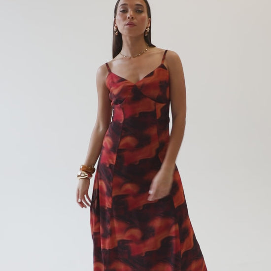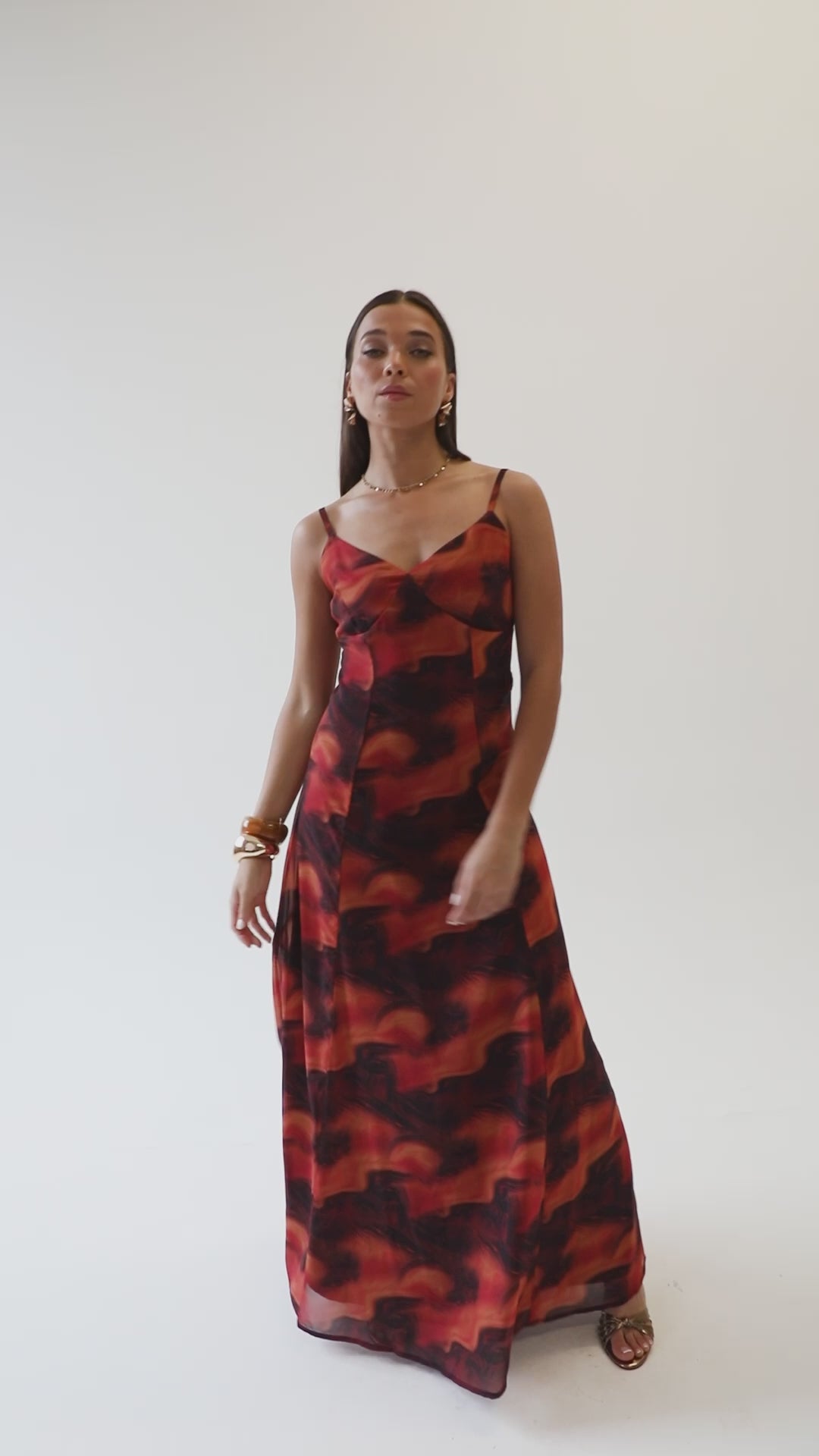 Elevate your occasion wardrobe with this effortlessly elegant maxi dress, a striking statement in both form and print. Rendered in a captivating fire marble motif, the design showcases rich tones of red, orange, and earthy brown, echoing the organic flow of molten stone. Defined by a cami-style bodice with adjustable straps, V neckline and a subtly contoured bust, the silhouette embodies relaxed refinement. Flowing effortlessly from the shoulders, the shift design flows into a loose, panelled A-line skirt, offering a flattering and unrestrictive fit. Style with black heels and gold accessories for a look that?s both refined and effortlessly chic.