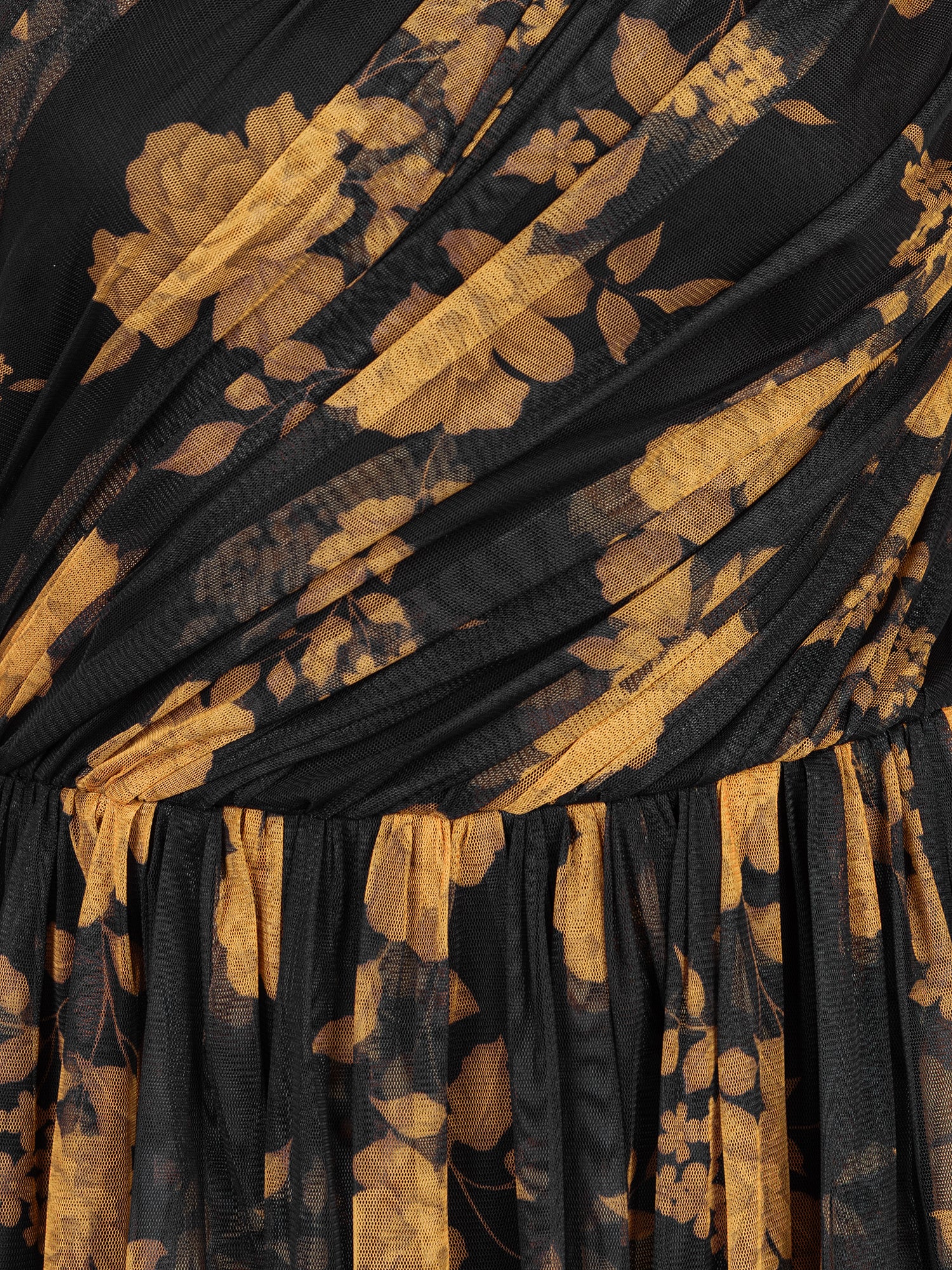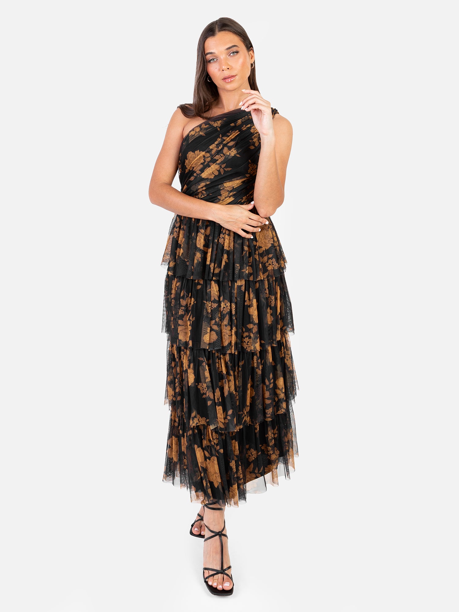 At Anaya with Love each item is consciously designed and made with 100% recycled fabric allowing you to embrace both style and sustainability. Designed in-house, the floral pattern in soft orange hues is set against a black tulle base, creating a harmonious blend that captures the season?s grounded, earthy aesthetic. This sleeveless, one shoulder midi dress features an elegant tulle overlay, gathered at the left shoulder and gracefully draped across the fitted bodice. The tiered design enhances movement with every step, forming a flattering A-line silhouette that's perfect for twirling. Style this floral piece with black heels and an orange clutch for a fun, immersive look.