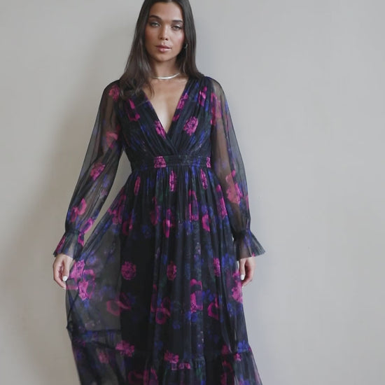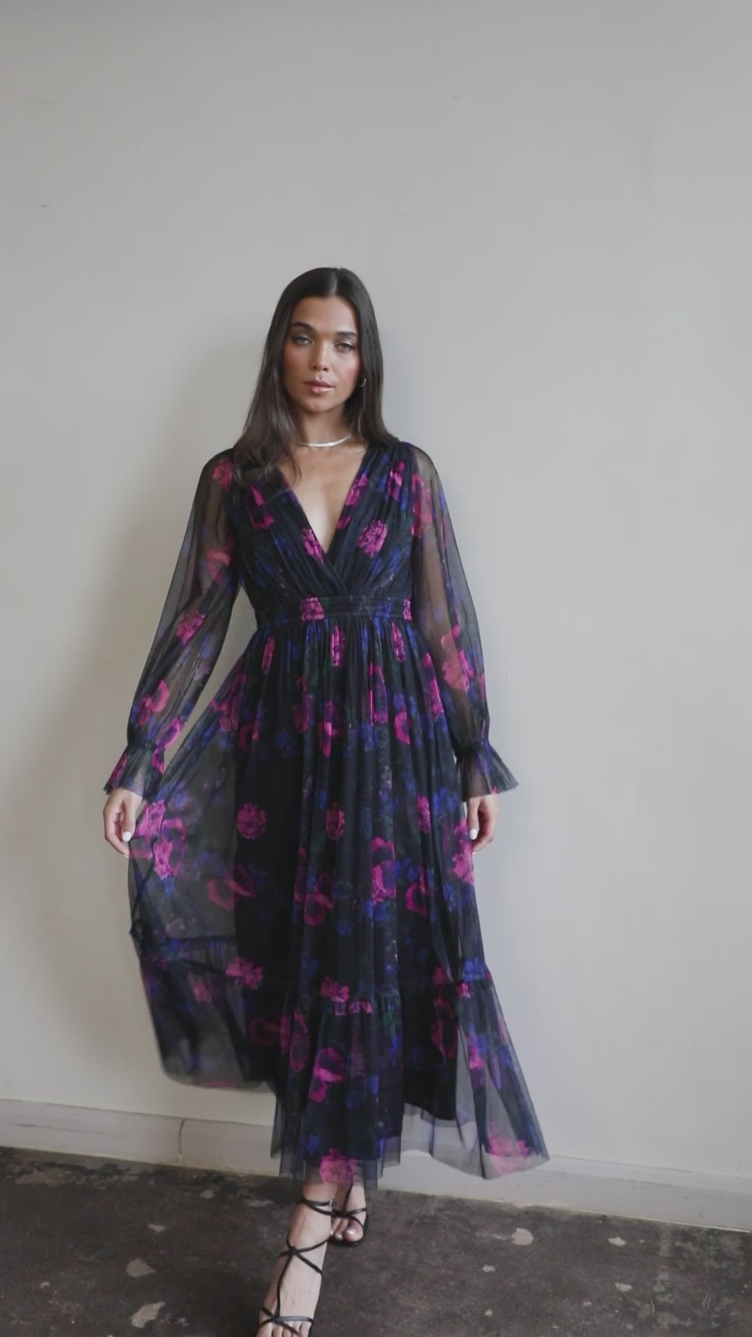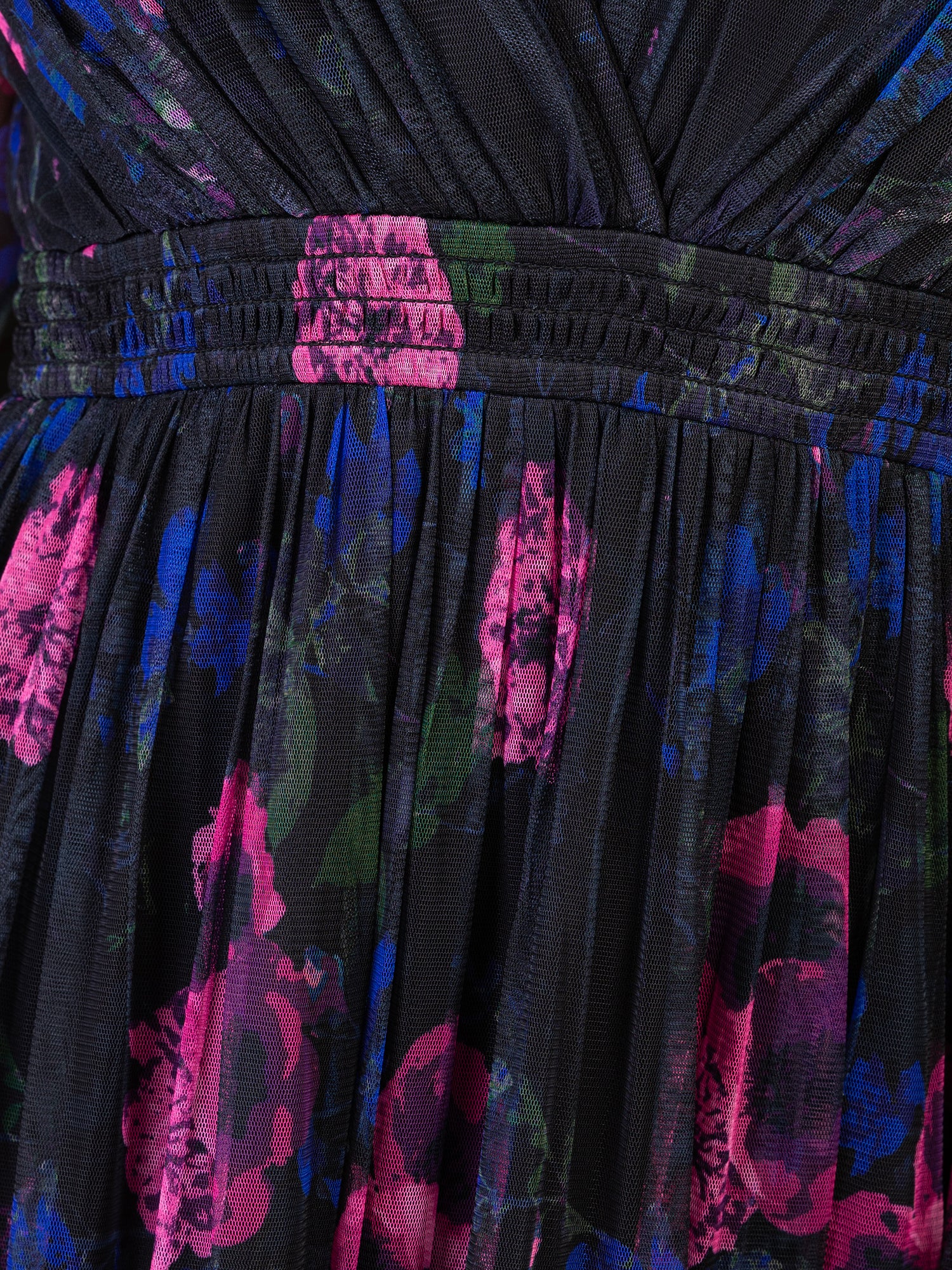 At Anaya with Love each item is consciously designed and made with 100% recycled fabric allowing you to embrace both style and sustainability. A captivating choice for wedding guest elegance, this navy dress strikes the perfect balance between modern allure and timeless femininity. Crafted from airy tulle and adorned with a striking floral print, the design features a faux wrap bodice with a flattering V-neckline, an elasticated waist for effortless definition, and sheer long sleeves for a contemporary finish. Cascading into an elegant A-line silhouette, the gathered skirt is thoughtfully panelled at the hem, creating an elongated shape and extra movement with each step. For a polished, harmonious look, coordinate your accessories with a hue drawn from the floral motif.