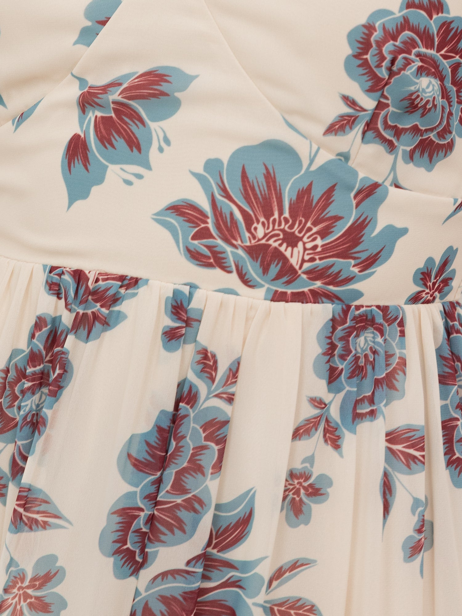 At Anaya with Love each item is consciously designed and made with 100% recycled fabric allowing you to embrace both style and sustainability. Whether you're attending a wedding, christening, or formal event, this dress is your go-to for making a stunning impression. With its timeless sweetheart neckline and romantic puff sleeves set on a structured bodice, it strikes the perfect balance between elegance and modern sophistication, complete with an alluring self-tie open back. The cream georgette fabric, adorned with delicate red and blue floral print, flows effortlessly into a tiered skirt that moves beautifully with every step. Pair it with strappy heels and minimal jewellery to let the dress truly shine.