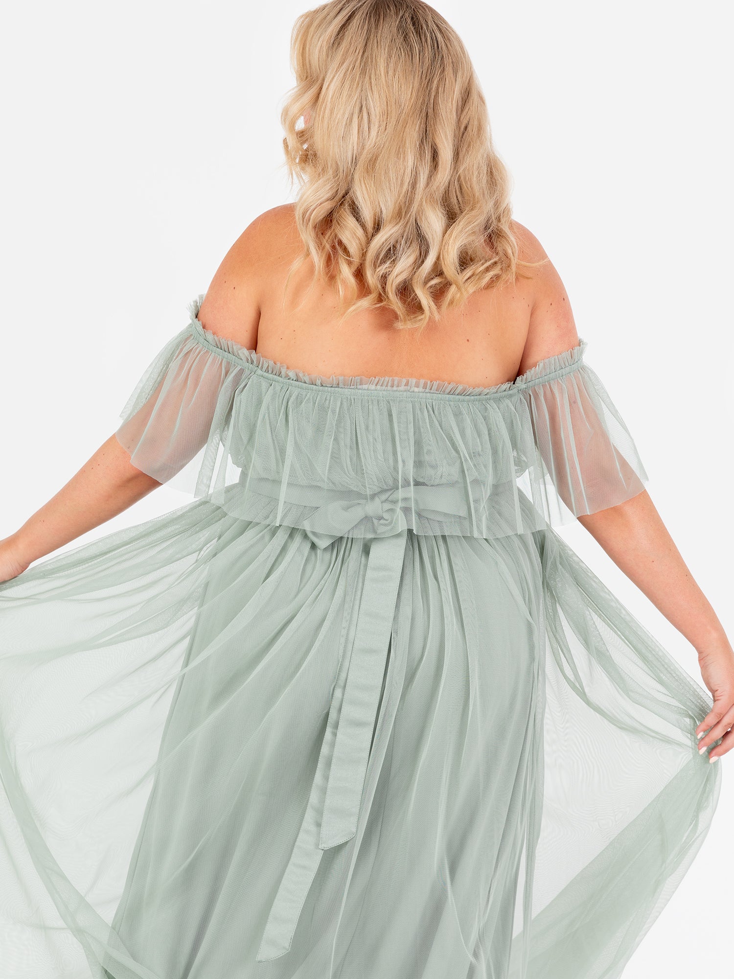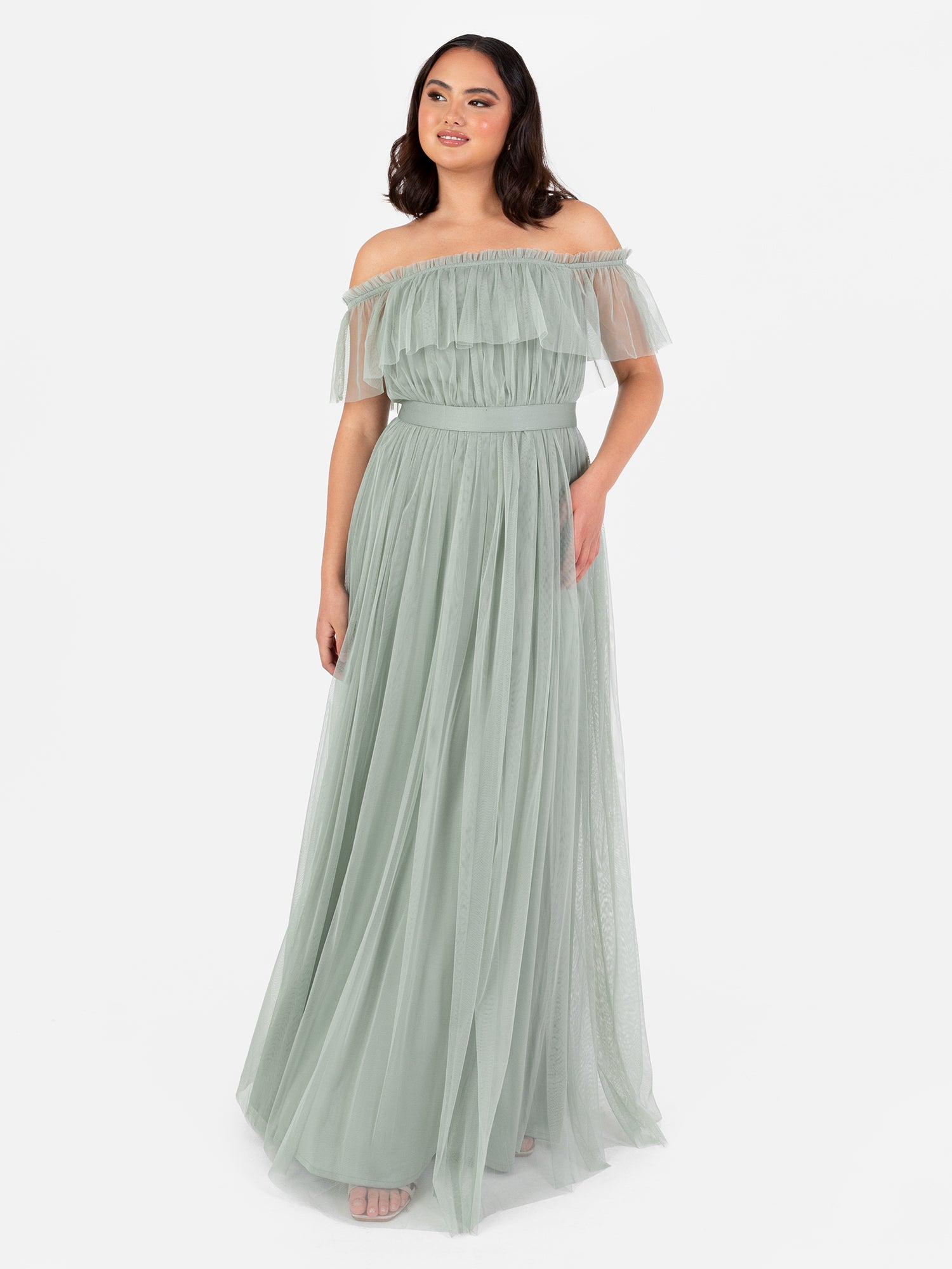 Anaya With Love Recycled Frosty Green Bardot Maxi Dress with Sash Belt