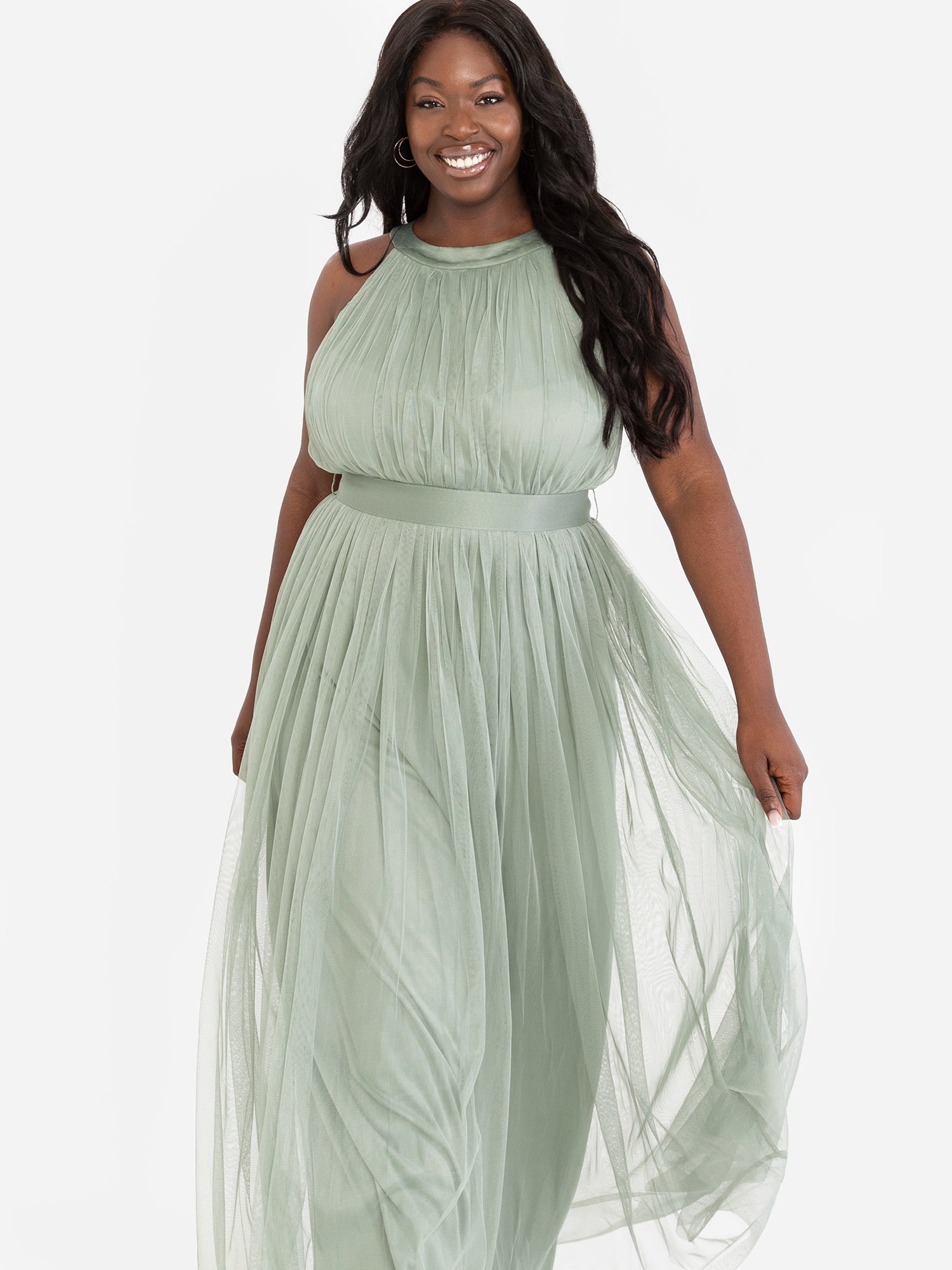 A dress straight from our most wonderful dreams, this Anaya dress has character and softness all in one. A beautiful halter neckline with tightly gathered tulle bodice decorated with satin trims adds charm to the design. Anaya’s signature Tulle maxi skirt flows into an A-line silhouette that’s flattering for all body shapes. This dress is body lined for comfortable wear, and a hidden zip fastening to the back allows for a seamless look.