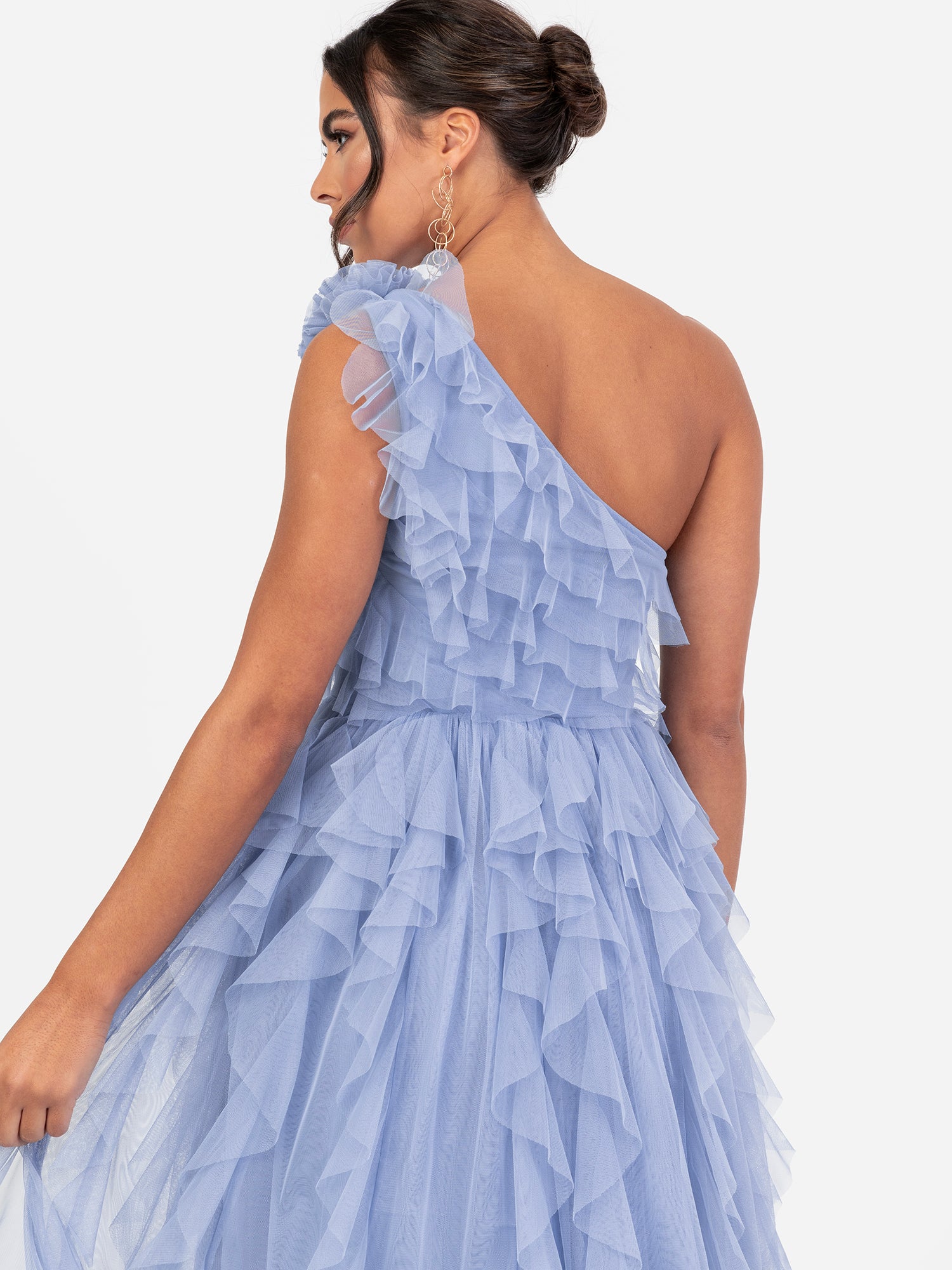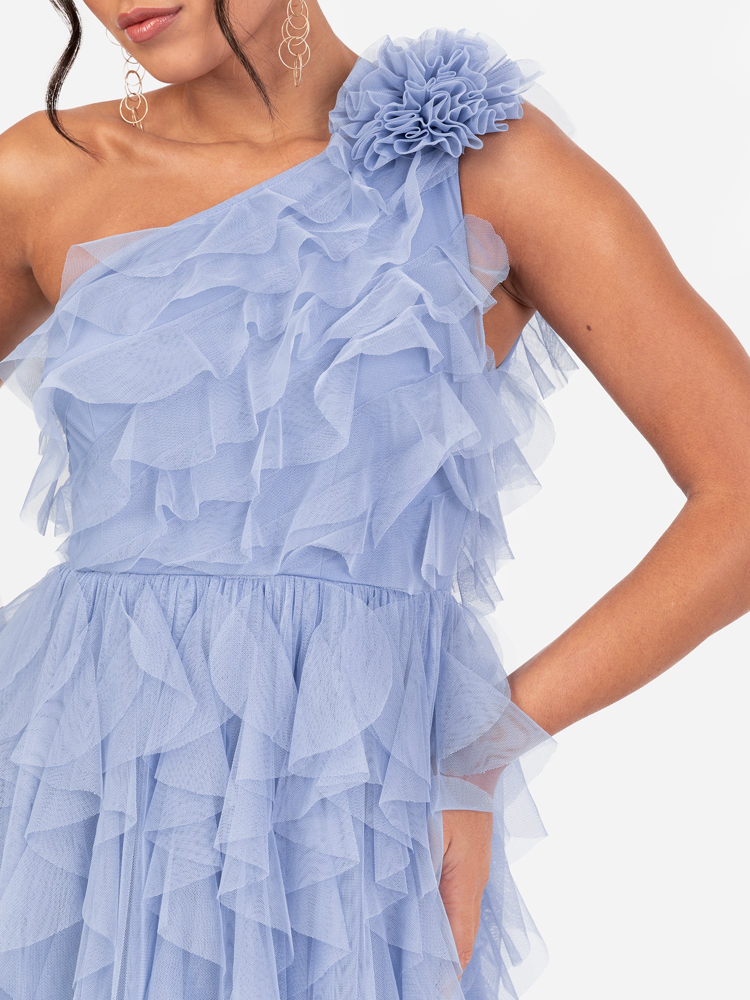 At Anaya with Love each item is consciously designed and made with 100% recycled fabric allowing you to embrace both style and sustainability. Stand out in the crowd with this mesmerising tulle maxi dress designed in an on-trend blue shade. The dress features all-over waterfall-style ruffling that adds dynamic movement to every step creating a truly captivating silhouette. The one-shoulder design accentuated by a statement corsage rose detail enhances the dress's elegant and feminine appeal. This striking piece pairs effortlessly with silver accessories and strappy heels for an unforgettable Prom look.