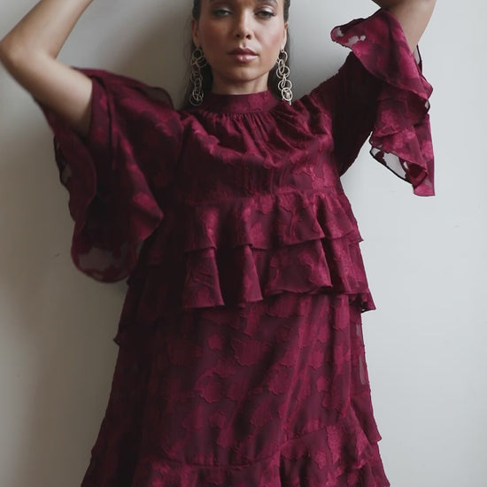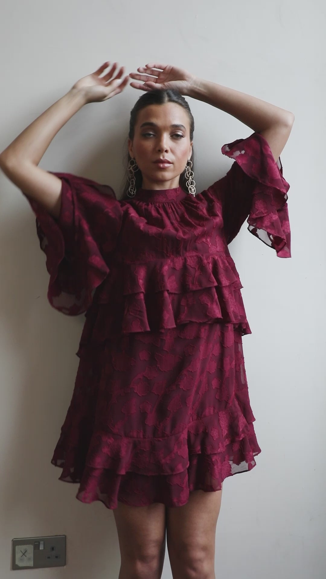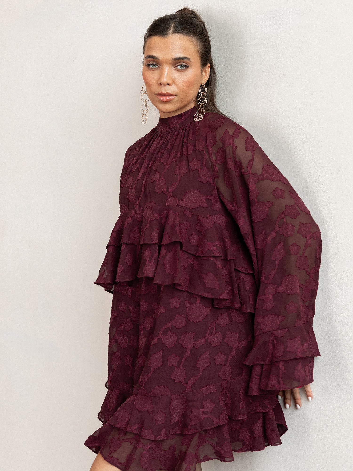 At Anaya with Love each item is consciously designed and made with 100% recycled fabric allowing you to embrace both style and sustainability. Effortlessly elegant with a touch of vintage charm, this mini dress is crafted from black floral burnout fabric that brings rich texture and subtle sheerness to the silhouette. The high neckline is secured with a delicate button-and-loop fastening, giving way to a softly gathered bodice and flared long sleeve that falls with ease. Ruffled tiers define the design, one placed just under the bust, the other accenting the hemline of the mini-length skirt, adding dimension and graceful movement. Designed in a relaxed shift silhouette, this dress offers a looser fit that flatters every body shape. Style with statement heels or boots to complete the look.