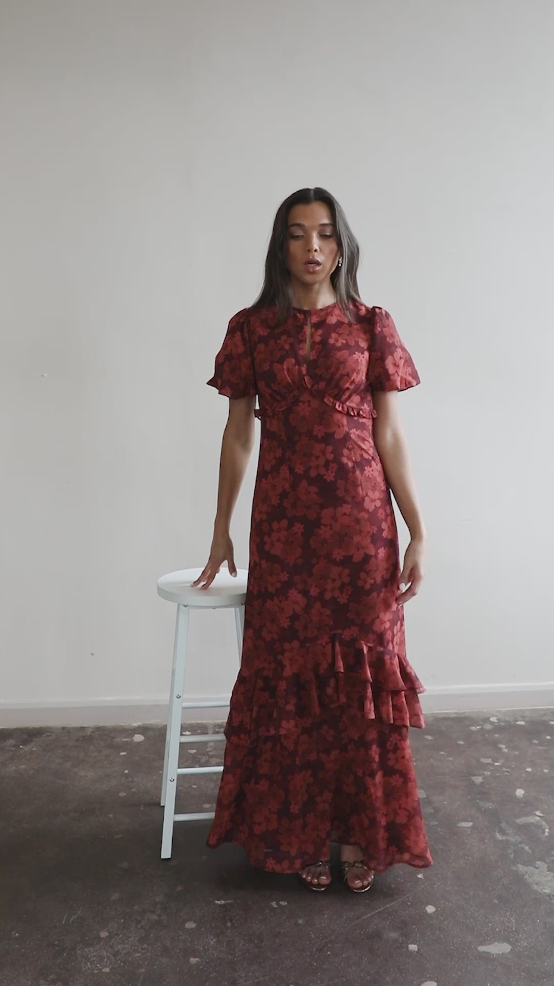 At Anaya with Love each item is consciously designed and made with 100% recycled fabric allowing you to embrace both style and sustainability. Embrace effortless elegance with our captivating floral maxi dress, perfect for any special occasion. Featuring an exclusive, in-house-designed floral print, this dress combines intricate details with graceful flair. The empire waist and lightly gathered bodice beautifully shape the figure, while short, puffed sleeves add a romantic touch. A daring keyhole detail falling from the round neckline enhances its allure. The flowing ruffled skirt cascades into a floor-grazing hemline, creating striking movement with each step. Pair this enchanting orange floral piece with delicate jewellery and strappy heels for a timeless look.