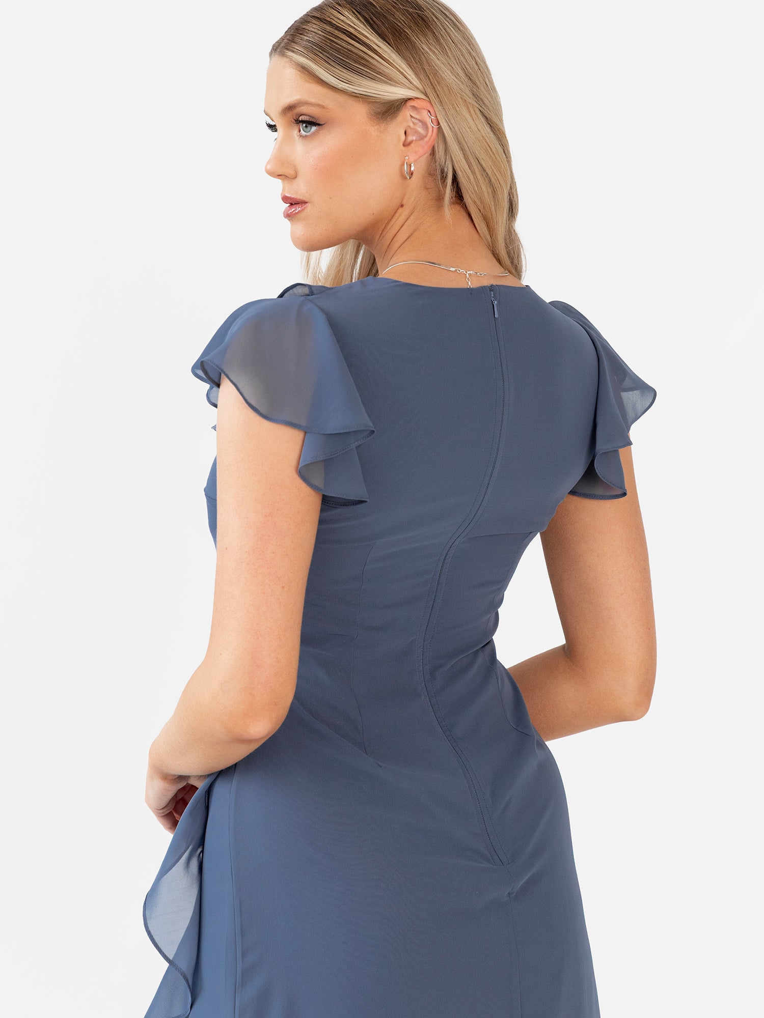 At Anaya with Love each item is consciously designed and made with 100% recycled fabric allowing you to embrace both style and sustainability. Radiating romance and refinement, this stunning gown epitomizes contemporary elegance. It features a flutter sleeve bodice complemented by a timeless V-neckline. A cascading ruffle layer traces the neckline and flows diagonally to the hip, while another ruffle descends from the waist, flowing across the skirt enhancing the silhouette with captivating allure. Complete your ensemble with silver heels and accessories for an effortless look.