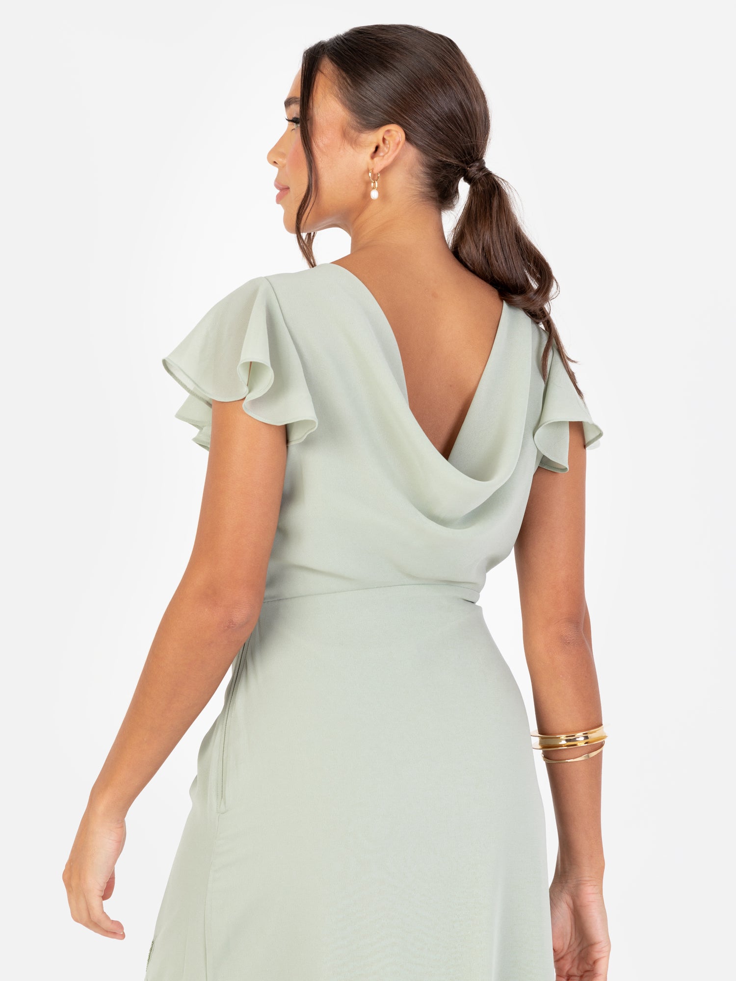 Elevate your bridal party ensemble with this enchanting bridesmaid dress. Fluttering short sleeves delicately frame the gathered bodice while a cinched waistline enhances the A-line silhouette. Most notably it features a dual neckline design: a classic round front that transitions into a gracefully draped cowl back for an alluring touch. Intricate floral embroidery adorns both the bodice and the flowing maxi skirt each detailed by hand sewn beads that add a subtle shimmer to every step. Style this Sage Green maxi with silver heels and dainty earrings for an effortlessly elegant look.