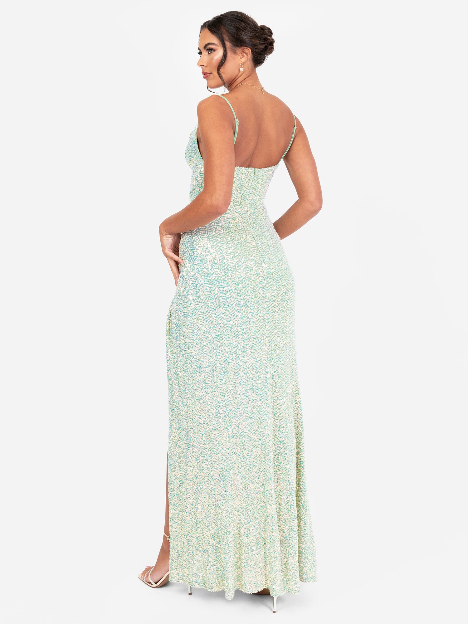 Turn heads and impress the crowd in this glamorous prom dress that’s all about making a statement. It features a sleek cami bodice with adjustable straps for a perfect fit and a soft cowl neckline that drapes elegantly across the front. Covered from top to bottom in small iridescent sequins creating a captivating shimmer with every move. This green gown flows into a stunning mermaid silhouette that hugs your curves before flaring gently at the hem with a daring thigh-high split that starts from a ruched detail on the hip adding both texture and a touch of intrigue. Style this dress with silver heels and a matching clutch bag.