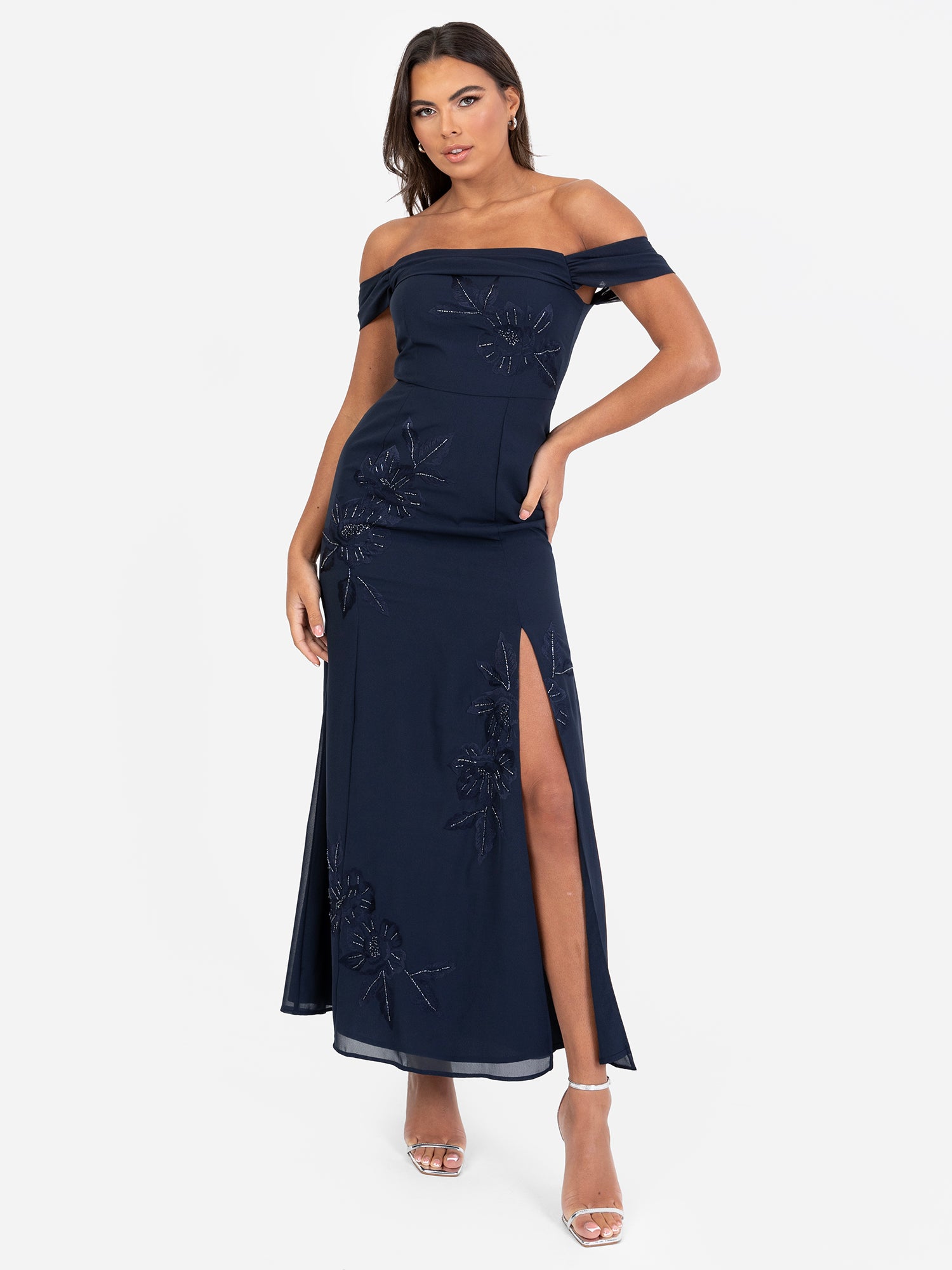 Maya Navy Floral Embroidered Bardot Maxi Dress with Skirt Split