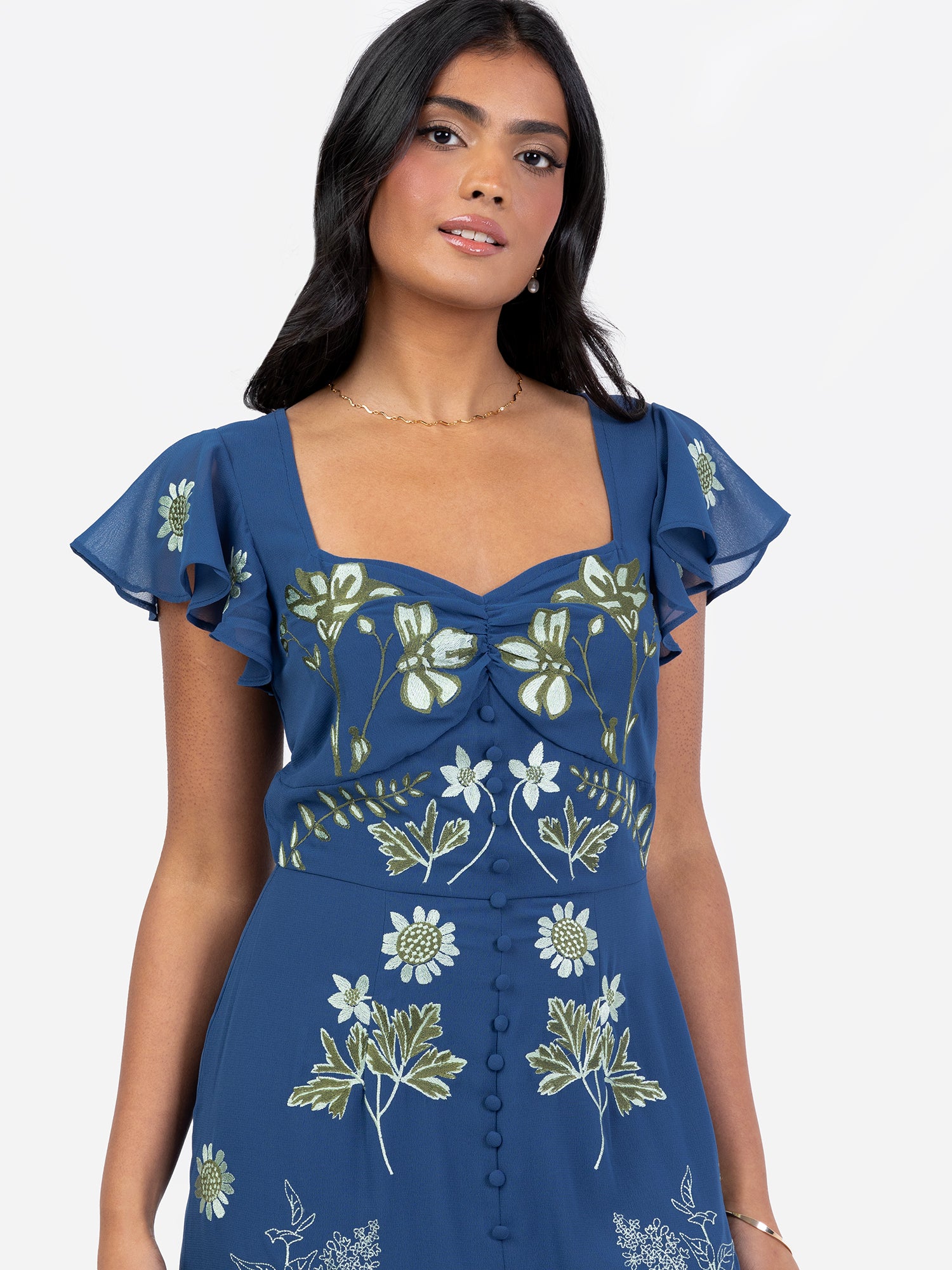 Renowned for its sophisticated detailing this summery sensation from Maya captivates with intricate embroidery and fine craftsmanship. The panelled bodice is complemented by short flutter sleeves and a V-neckline while the alluring keyhole back contrasts beautifully with faux buttons down the front. The maxi length creates a modern A-line silhouette enhanced by a daring front split—perfect for the dancefloor. Complete the look with golden accessories and strappy heels for a fabulous finish.