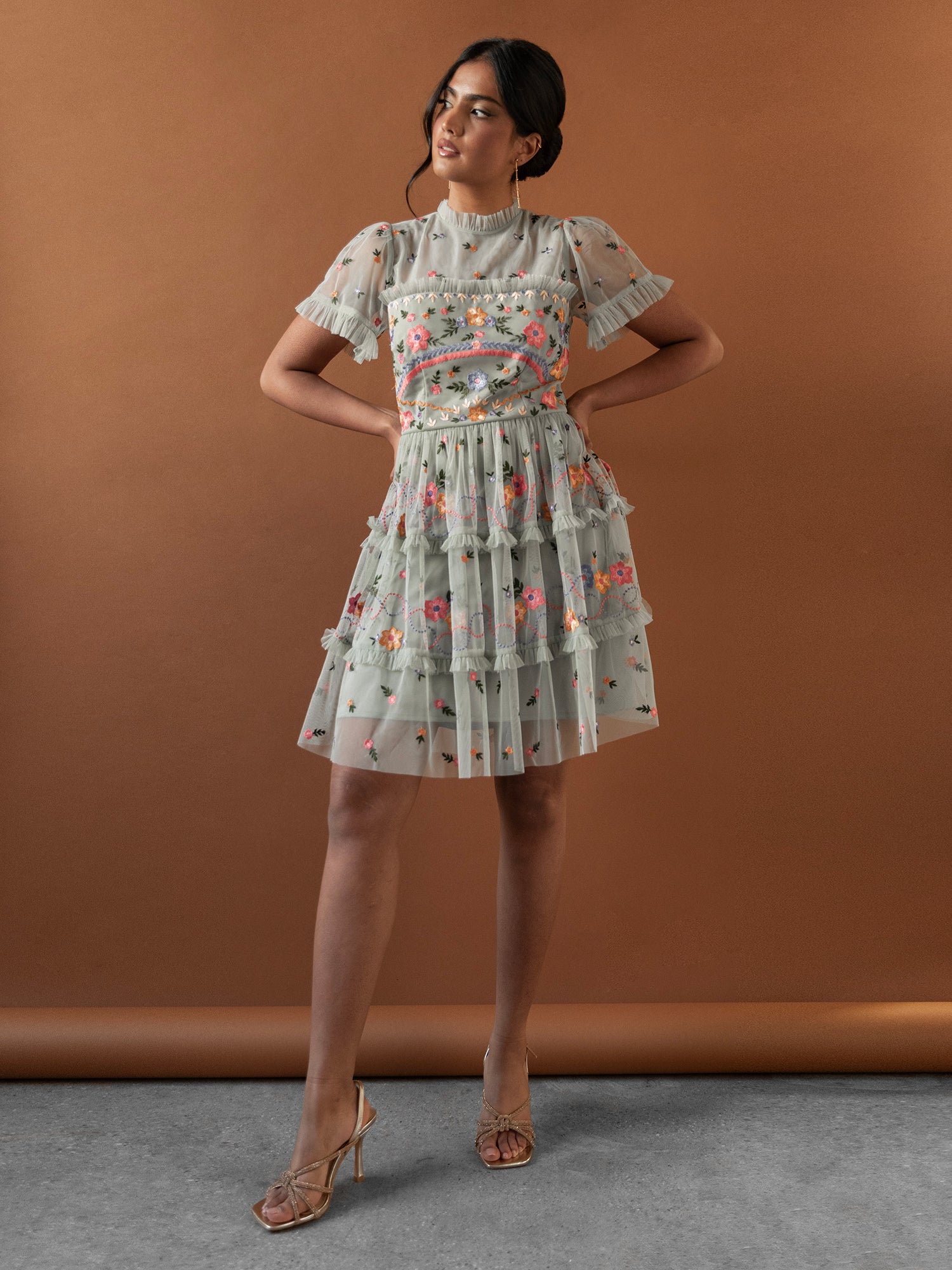 A romantic look for the most extraordinary moments. This sage green tulle mini dress is adorned with vibrant floral embroidery that flows elegantly along the high-neck bodice and sheer short sleeves. The tiered skirt captures the cheerful and enchanting essence of blooming gardens reflecting the playful charm of this mini. Frill trims along the neckline sleeves and each tier of the skirt create an effortlessly stylish aesthetic with a carefree persona. For every new occasion choose a colour from the intricate needlework to personalise your look.
