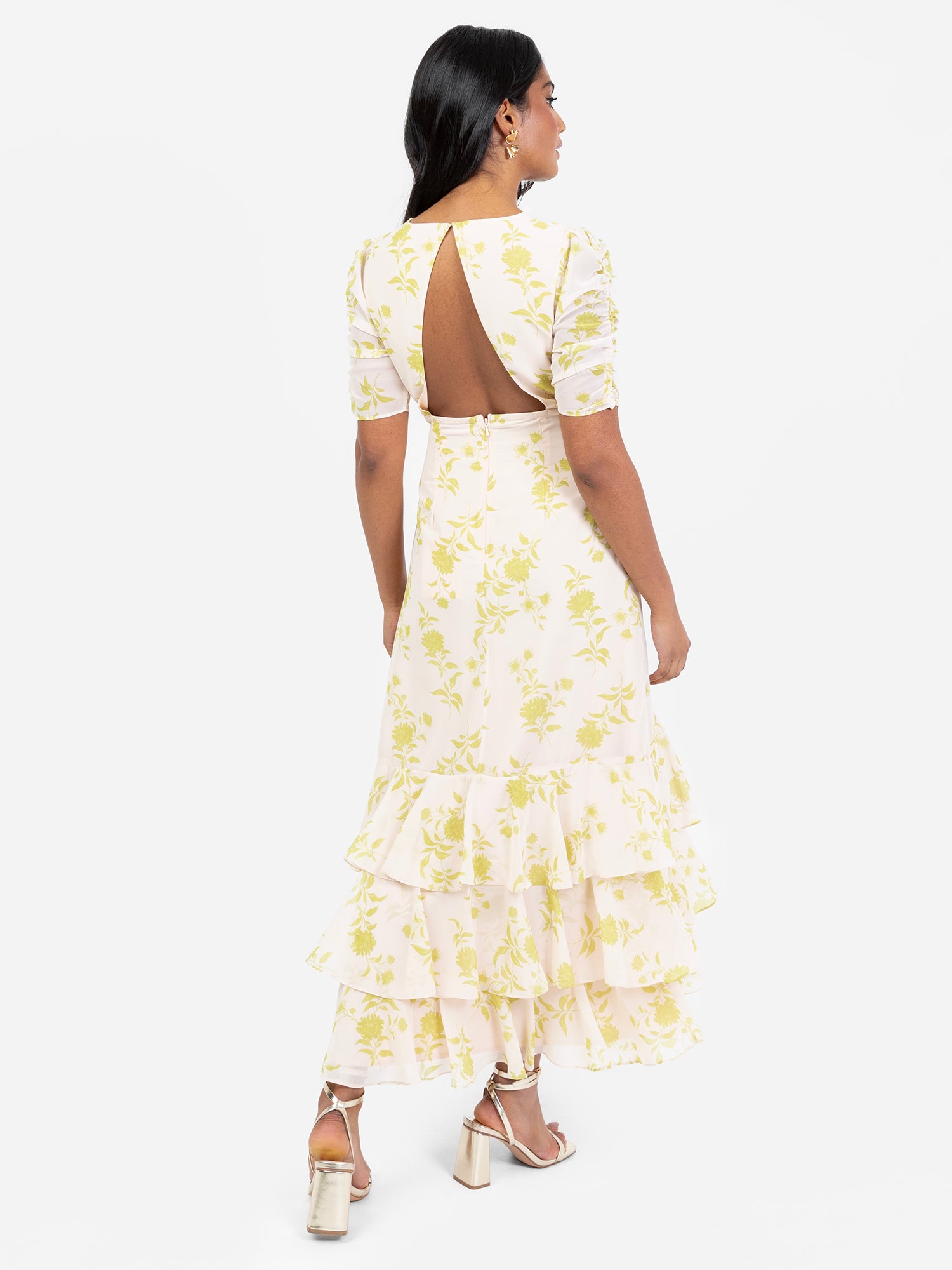 At Anaya with Love each item is consciously designed and made with 100% recycled fabric allowing you to embrace both style and sustainability. From its intricate floral pattern to its flowing ruffled skirt this dress is the epitome of effortless elegance for any special occasion. In-house-designed floral print adorns this midi silhouette complementing features like the empire waist and a lightly gathered bodice that shapes the bust. Ruched short sleeves add a touch of romance while a daring open back offers an alluring finish. The layered ruffles cascade gracefully into a high-low hemline creating striking movement with each step. Pair this floral piece with statement jewellery and kitten heels for a timelessly look.