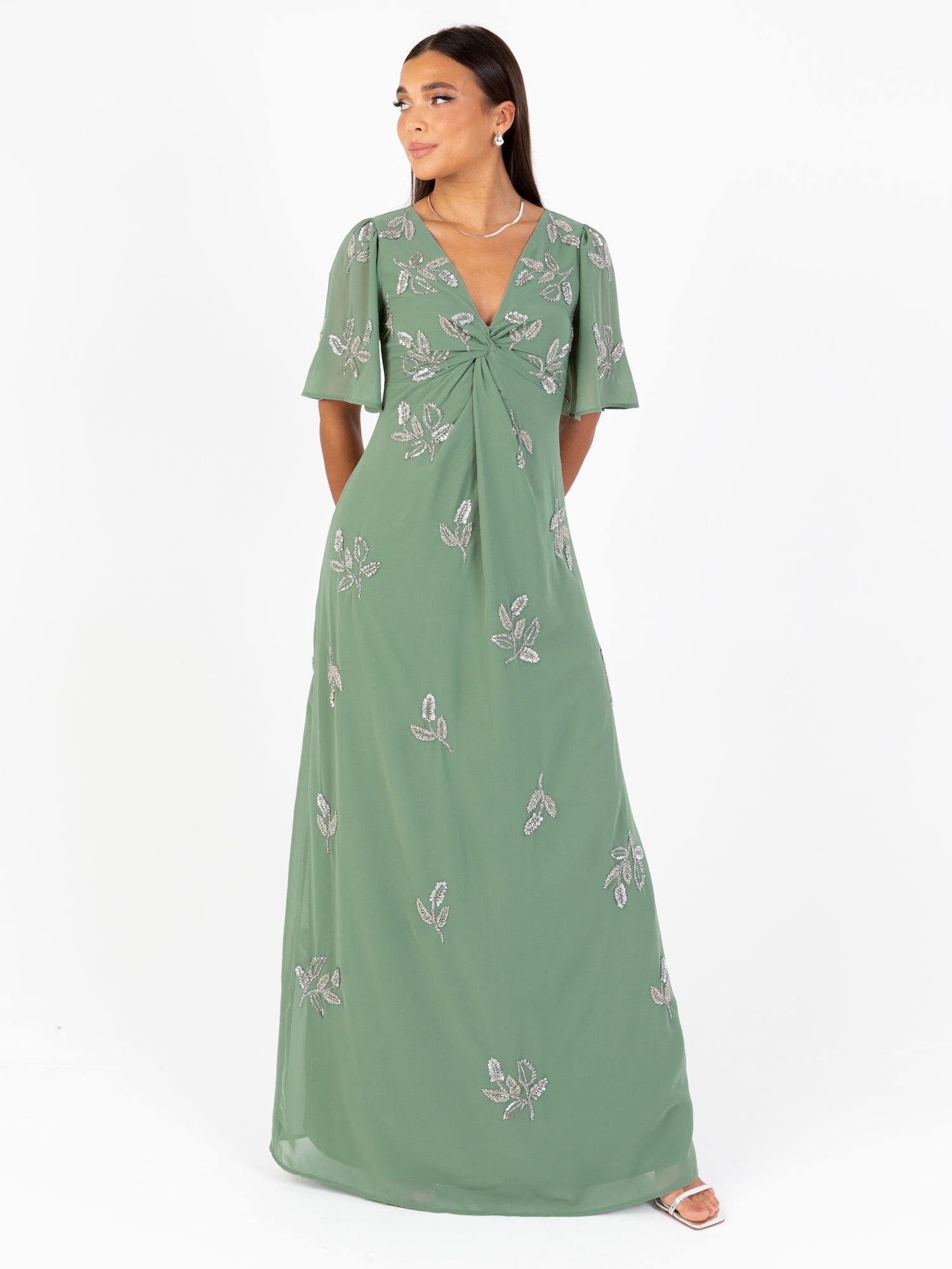 Maya Dark Sage Green Embellished Knot Front & Angel Sleeve Maxi Dress
