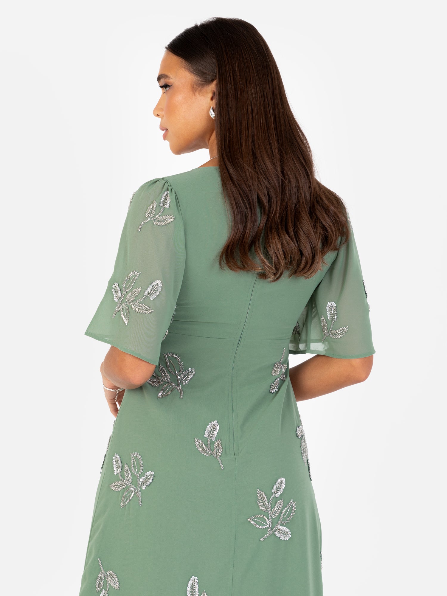 A perfect choice for summertime weddings and special occasions. The timeless bodice is adorned with shimmering sequin and bead motifs, while elegant angel short sleeves add a touch of ethereal grace. A subtle knot detail at the base of the V-neckline lends a contemporary edge to the classic design. The A-line maxi skirt is beautifully embellished with matching silver motifs, creating a cohesive and polished look. Simply style this dress with silver strappy heels and a dainty necklace.