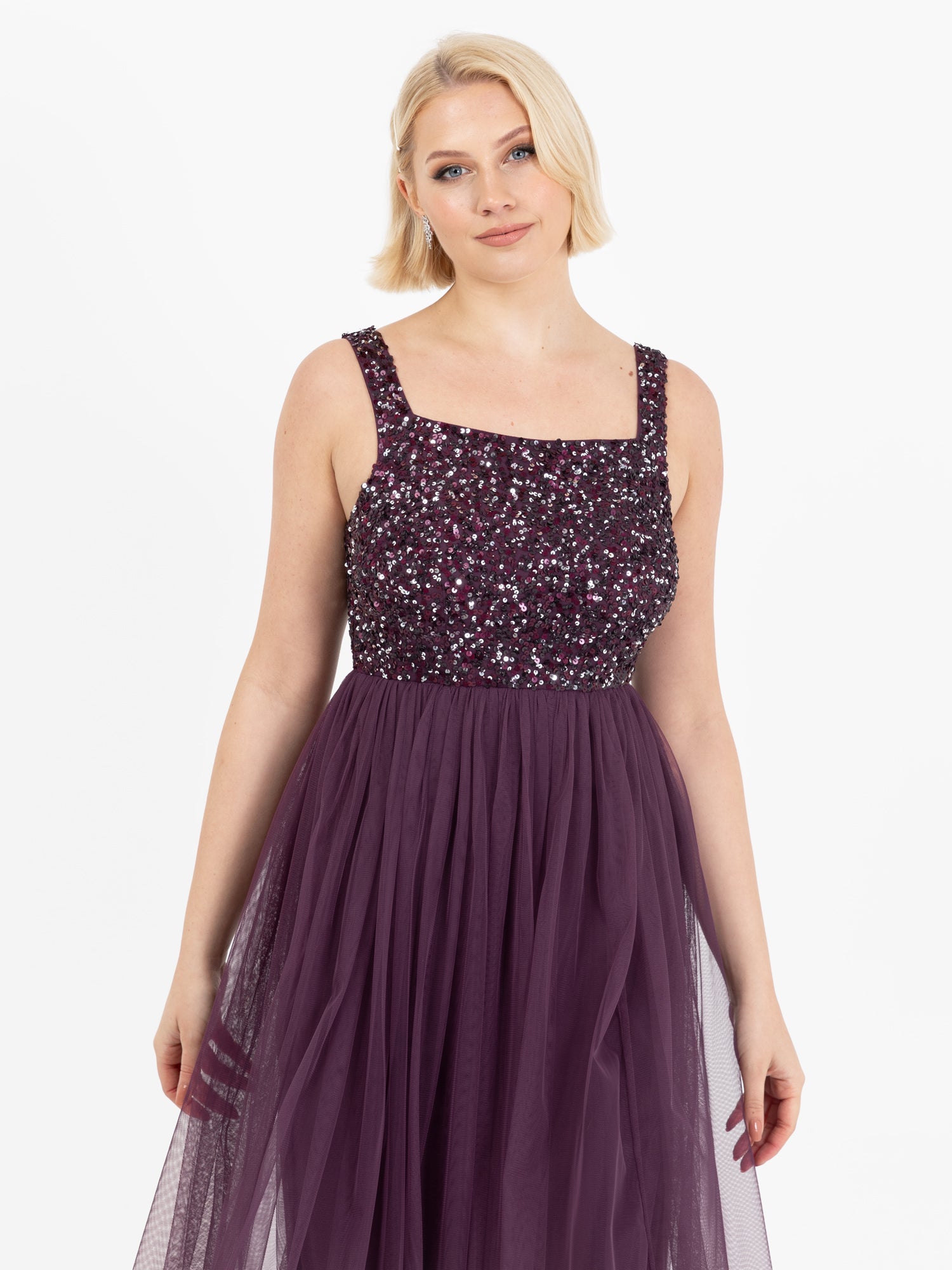 Discover the ideal strappy maxi dress from our latest Maya Deluxe collection. With a fully embellished bodice featuring a square neckline and slender straps it embodies a trendy glamorous style. Tulle maxi skirt allows you to dance freely throughout the day with it’s A-line silhouette that’s flattering on all body shapes. Complete the look with shimmering accessories and a chic clutch bag.
