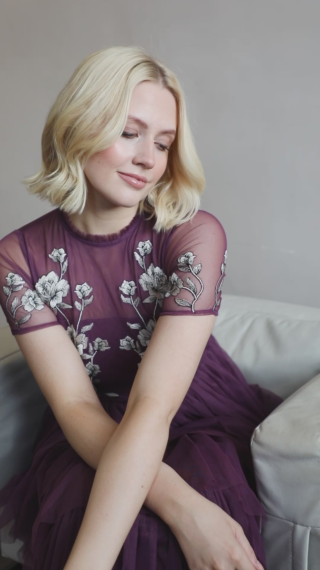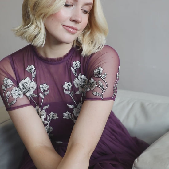 A vision of modern romance, this ankle-length dress is defined by its cascading tiers of gathered tulle, creating a voluminous, ethereal silhouette. The short-sleeved, sheer yoke bodice is framed by a high frill-trimmed neckline, while delicate floral embroidery in contrasting black and white thread lends a refined, textural finish. A graceful choice for elegant soirees and special occasions alike, this midaxi dress pairs beautifully with strappy heels and gold accessories for a refined, feminine finish.
