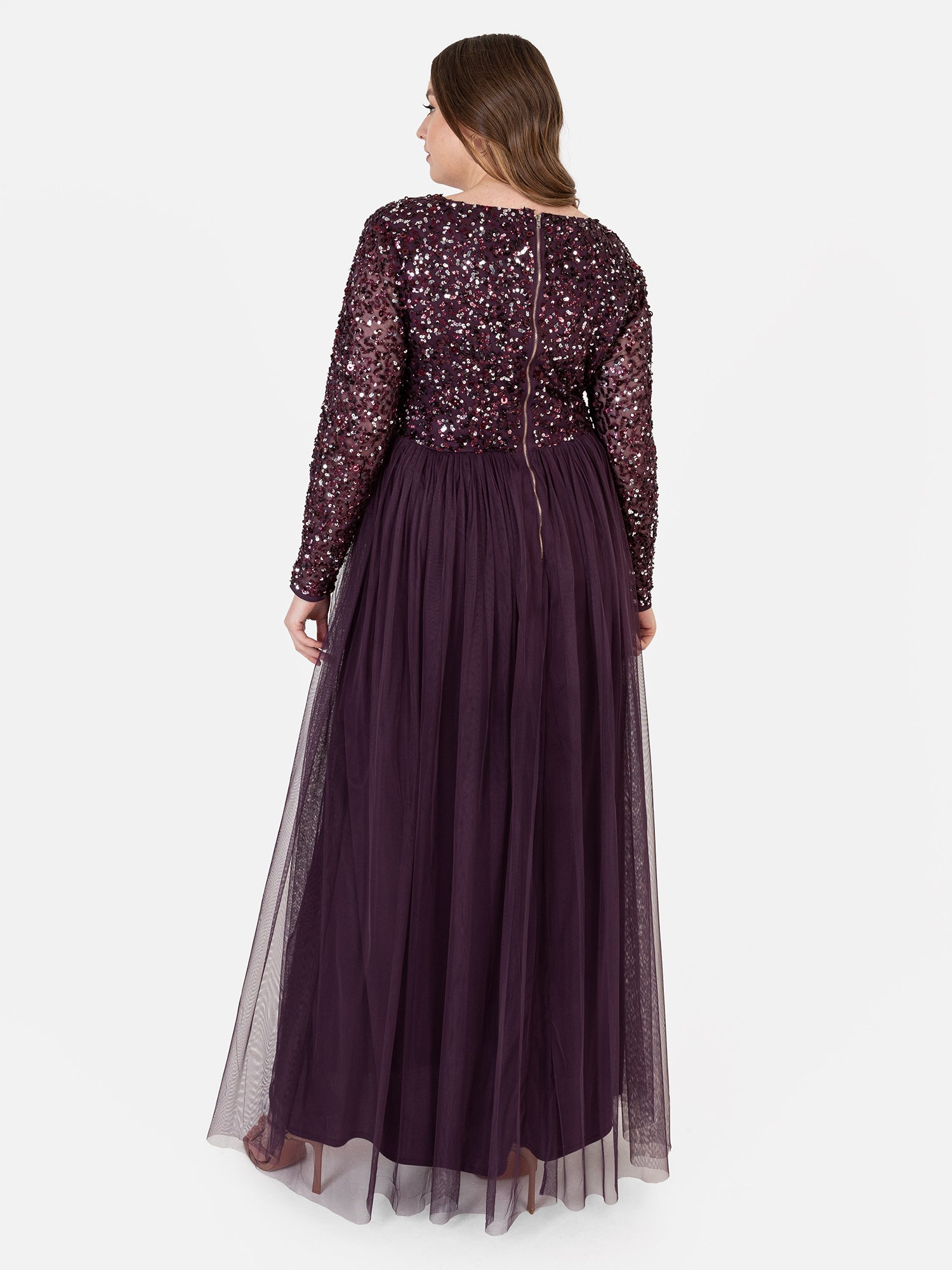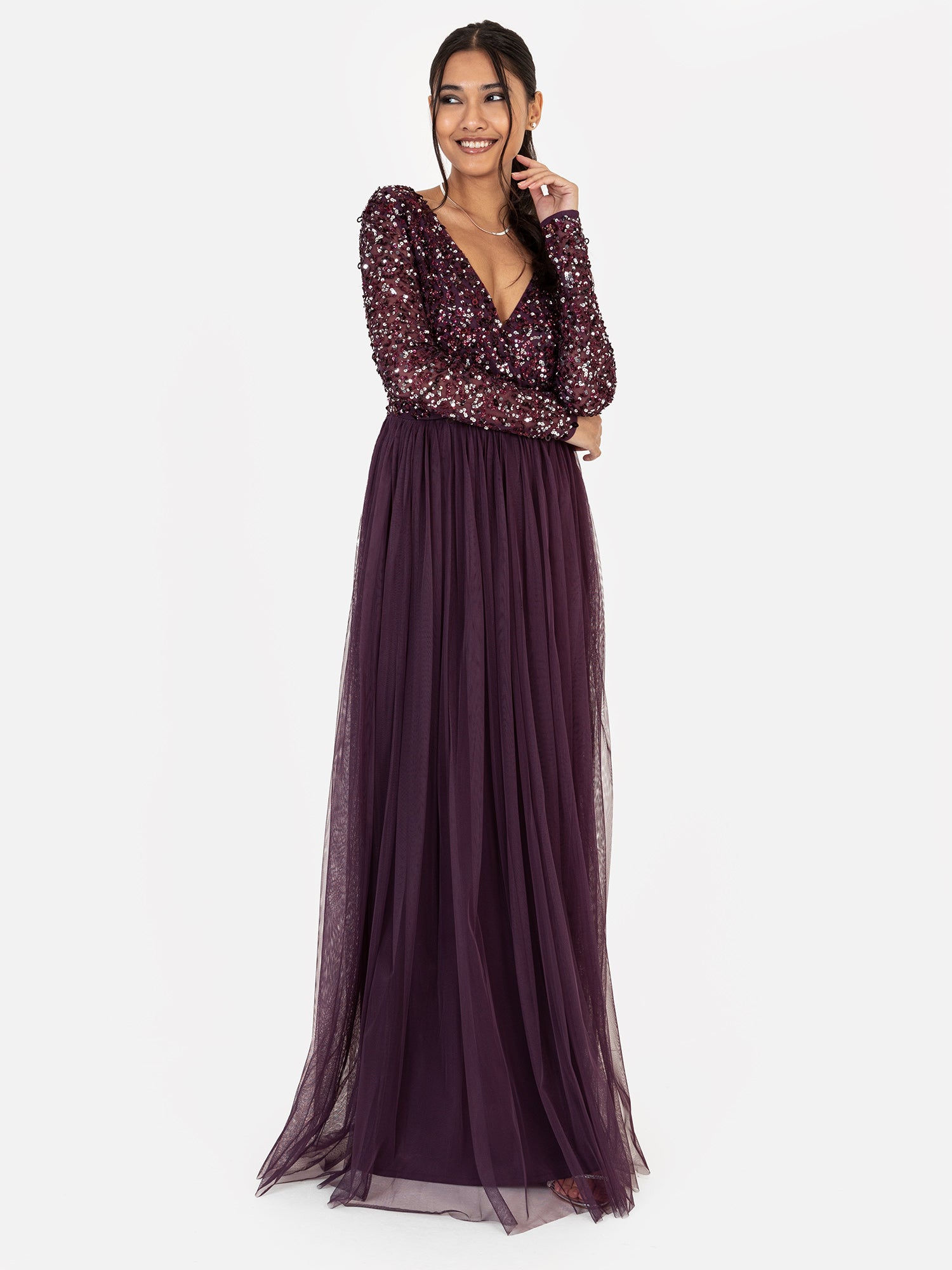Achieve effortlessly glamorous style with this maxi Berry dress. Designed with intricacy in mind this long sleeve and faux wrap bodice with deep V Neckline is drenched with sequin embellishment. Different shapes and sizes of the sequin reflect the light in their own way adding depth and sophistication to this dress. Whereas the soft tulle midi skirt is a whimsical addition that ties this piece together into a dress you will want to wear over and over again.