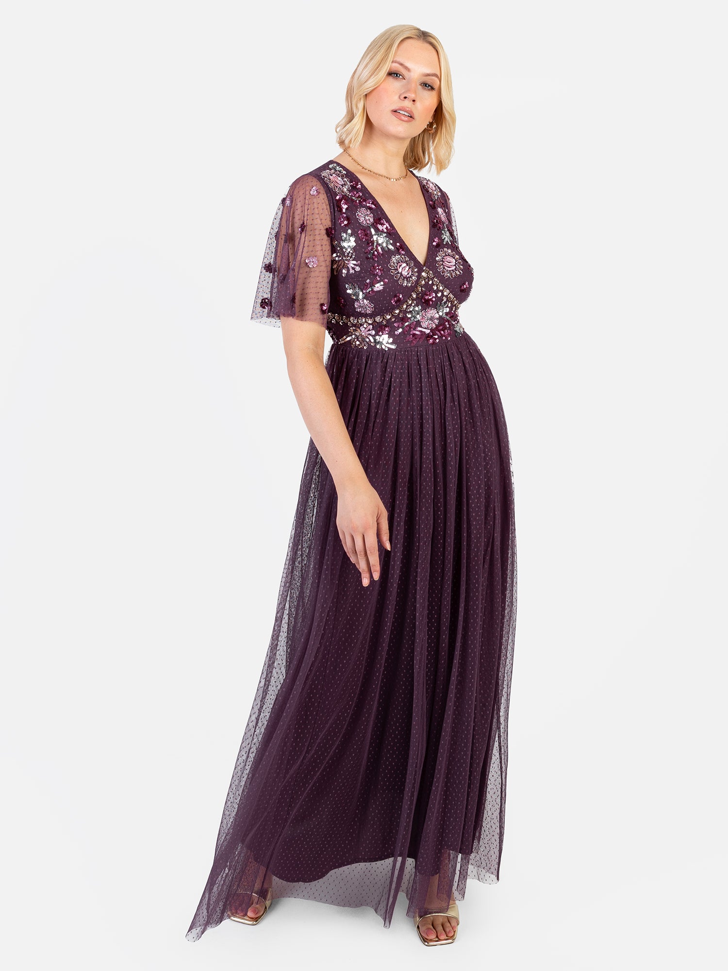 Renowned for their use of intricate embellishment and soft fabrics Maya designed yet another style that doesn’t fall far from spectacular. Meticulously placed sequin and beads form floral motifs that elegantly adore the V neck bodice and sheer short sleeves. Spot mesh tulle continues to fall into an A-line silhouette that’s comfortable for all body shapes leaving plenty of room to dance the night away. Its purple Berry hue makes this maxi dress a versatile piece so you can wear it again and again. Style with silver accessories and strappy heels for an evening soiree.