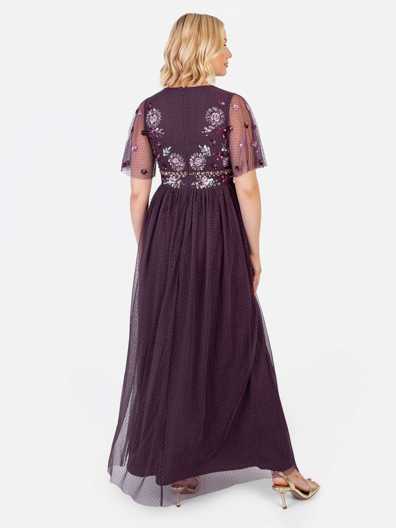 Maya Berry Floral Embellished Spot Mesh Maxi Dress