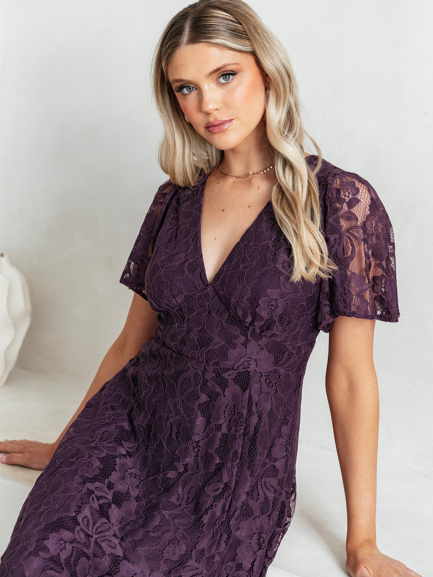 Maya Berry Lace V Neck Angel Sleeve Maxi Dress