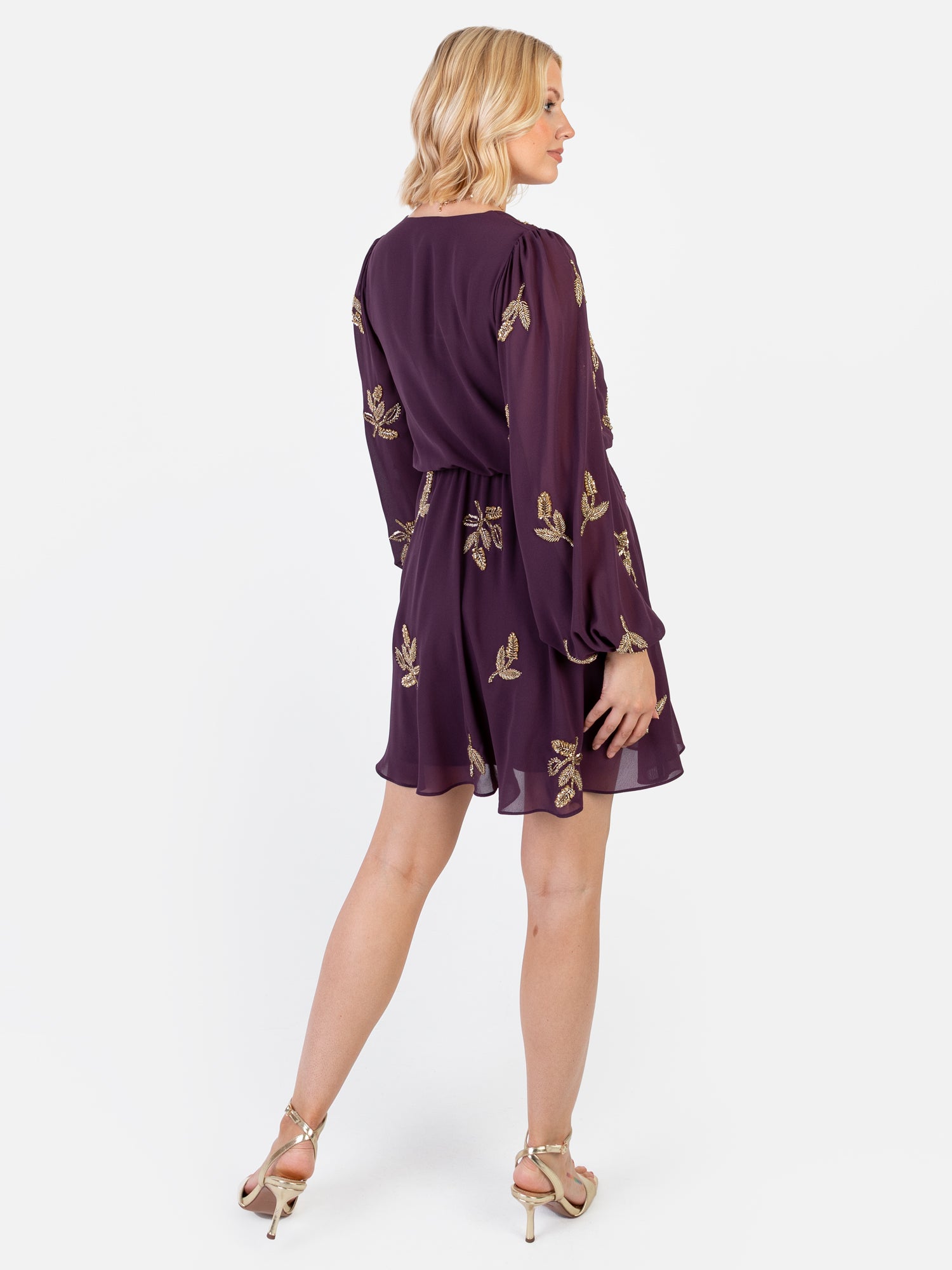 Maya Berry Leaf Embellished Long Sleeve V Neck Mini Dress