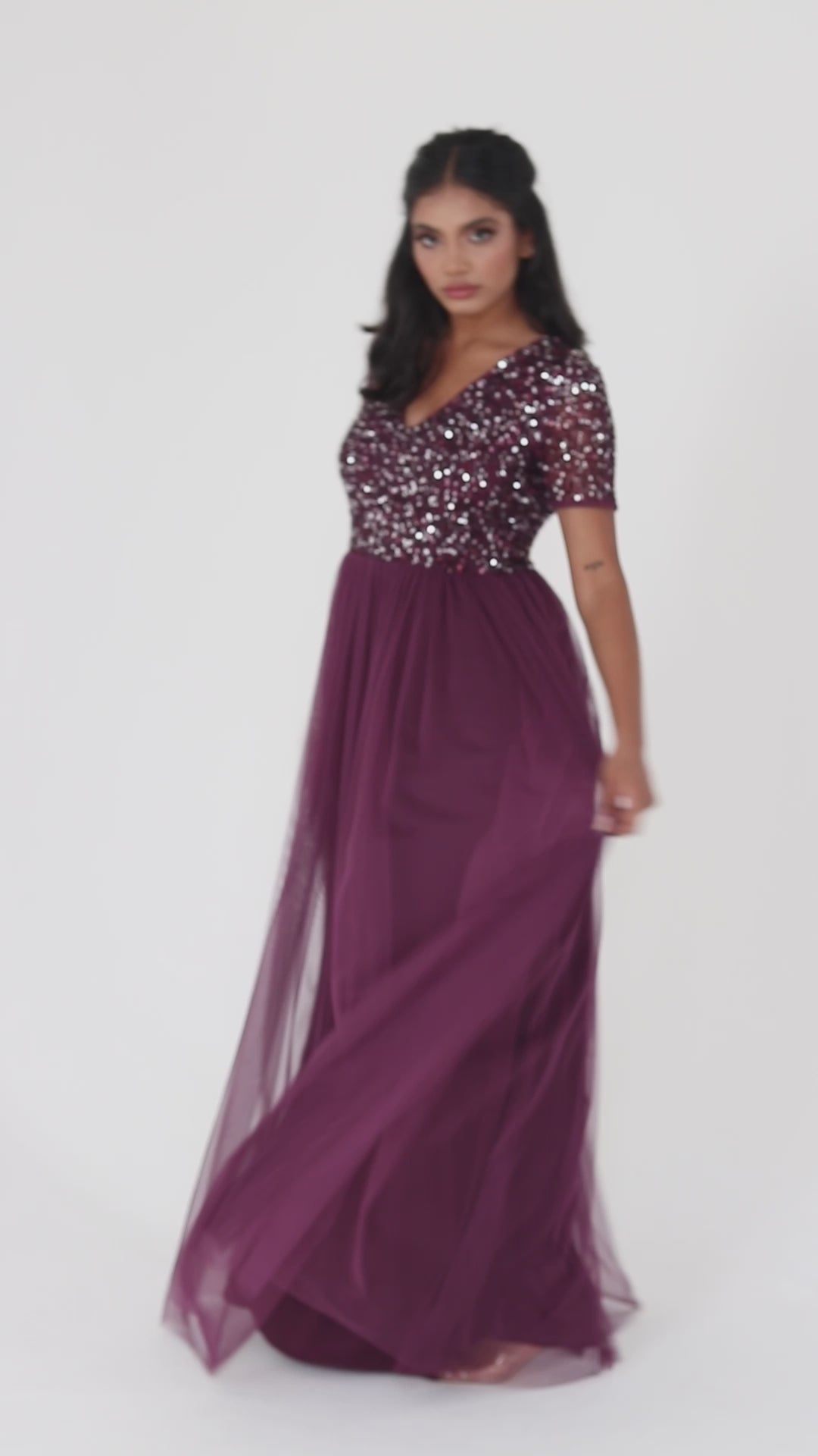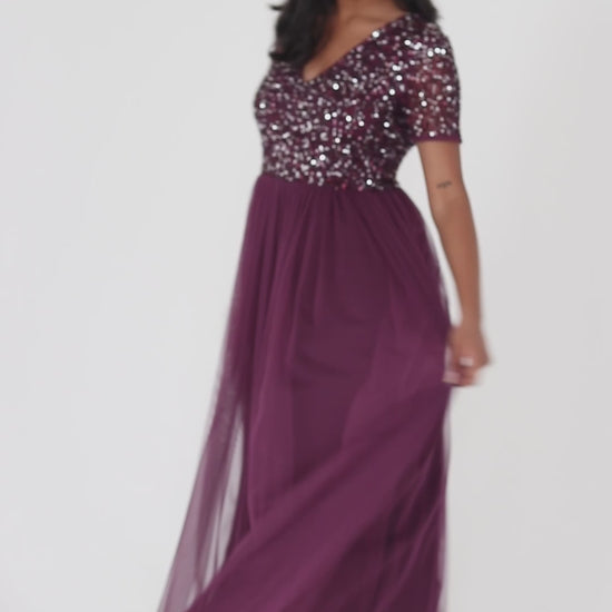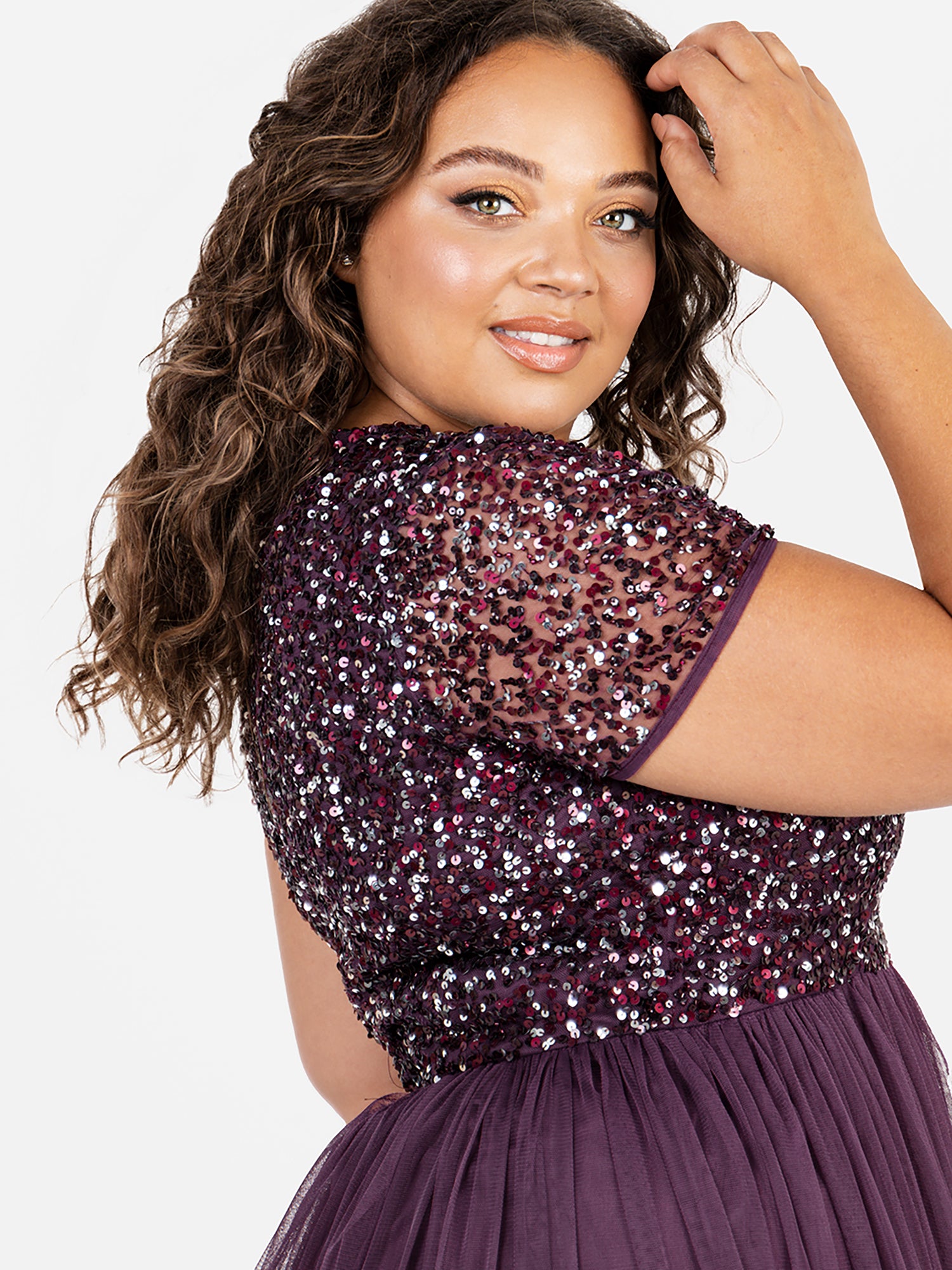 Years of refinement have created the picture-perfect bridesmaid dress especially curated for your big day. The fitted short sleeved bodice enhances the beauty of the dress with hand embellished sequin shimmering atop the tulle overlay. Contrasting soft tulle skirt gracefully flows from the cinched waist embracing an A-line silhouette that complements any figure. Style this V neckline maxi skirt with strappy heels and drop earrings to complete the bridesmaid look.