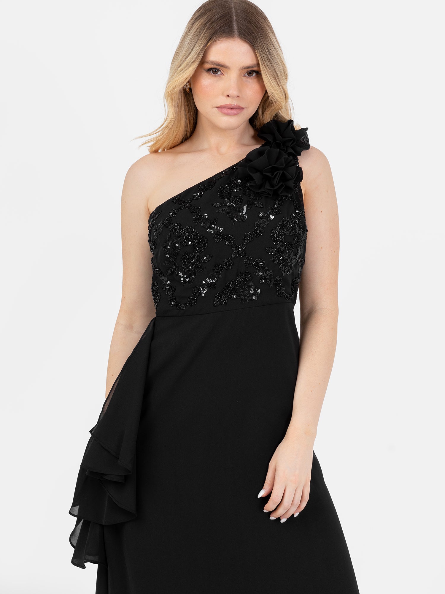 Maya Black Embellished One Shoulder Maxi Dress with Rosette Detail