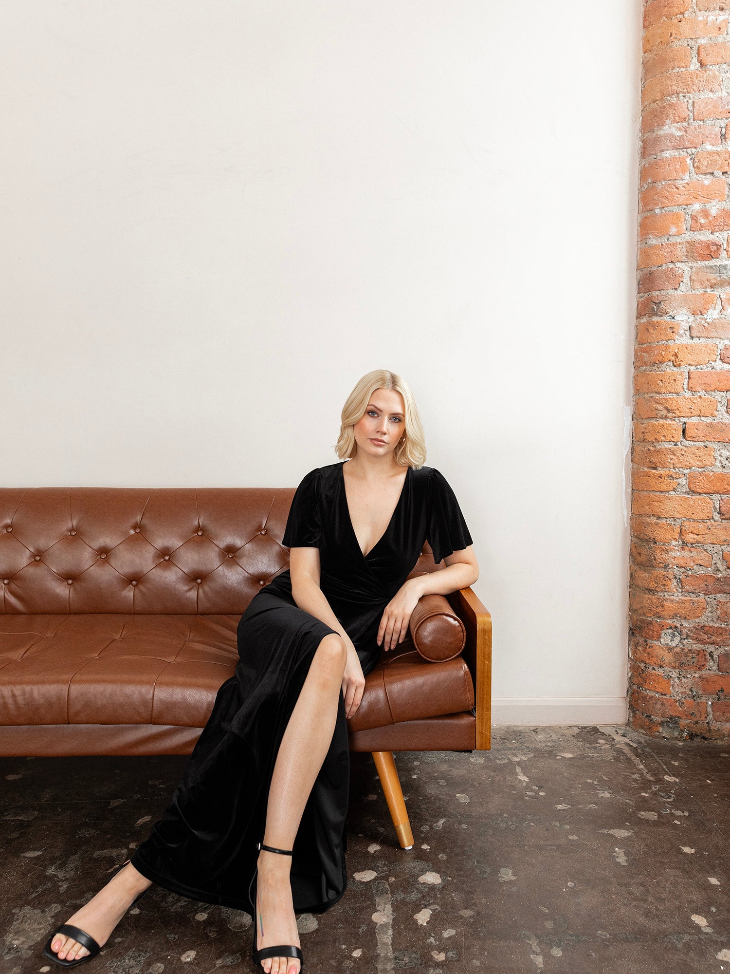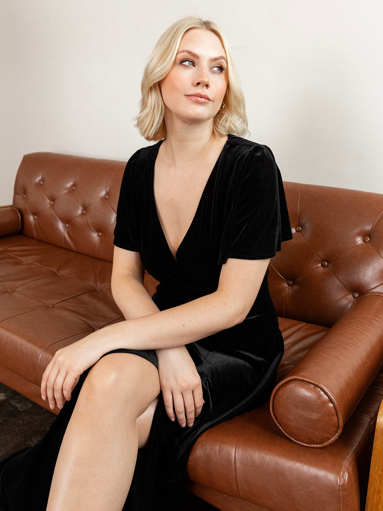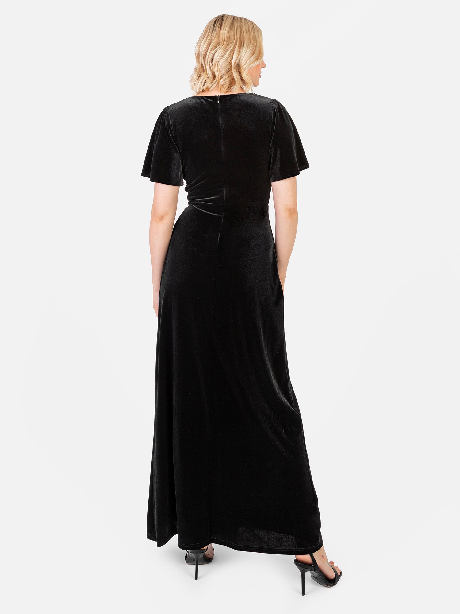 Explore our latest collection of velvet bridesmaid dresses where opulent fabric and timeless design come together to create an unforgettable bridal party look. Crafted in luxurious velvet this elegant gown features a sophisticated faux-wrap bodice that forms a classic V-neckline perfectly balanced by a concealed split in the flowing maxi skirt for a touch of refined allure. Delicately gathered short angel sleeves add soft structure at the shoulders while the graceful A-line silhouette gently skims the figure for a beautifully feminine finish. Style with strappy heels and shimmering accessories for effortless elegance.