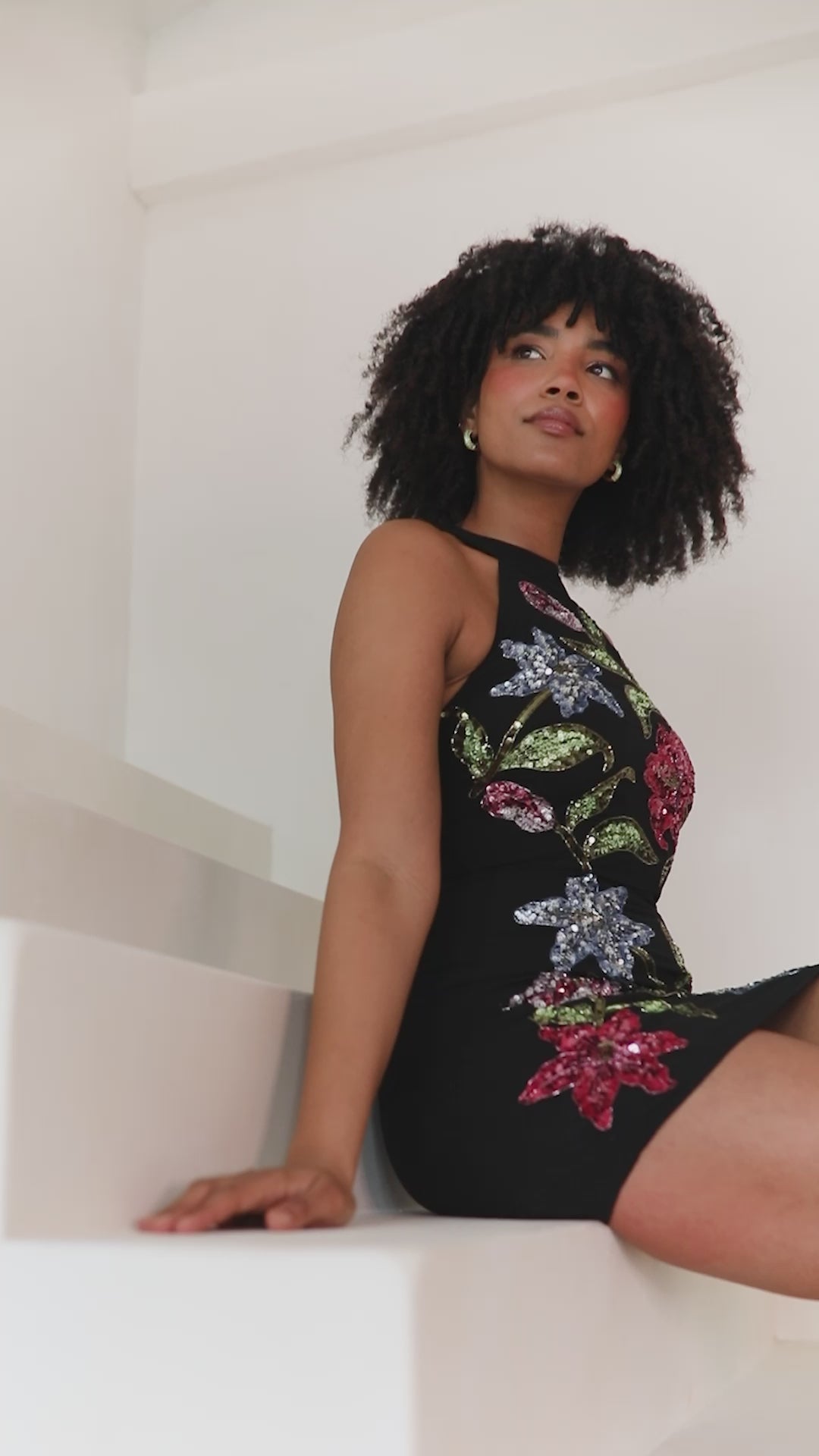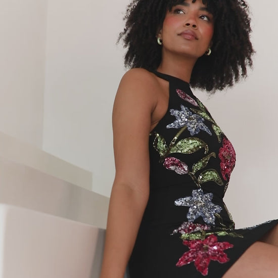 A sparkly new addition to your collection of little black dresses. The sleek halter neckline exudes sophistication while the keyhole detail at the back secured with a hook-and-eye fastening adds a touch of allure. A true masterclass in craftsmanship this midi dress is adorned with hand-sewn floral motifs intricately embellished with vibrant blue green and pink sequins and beads. The result? A striking statement piece perfect for making an entrance this party season. Style this black mini dress with strappy black heels or choose a colour from the embellishment to add a pop of contrast and create a unique eye-catching ensemble for every occasion.
