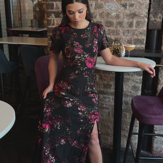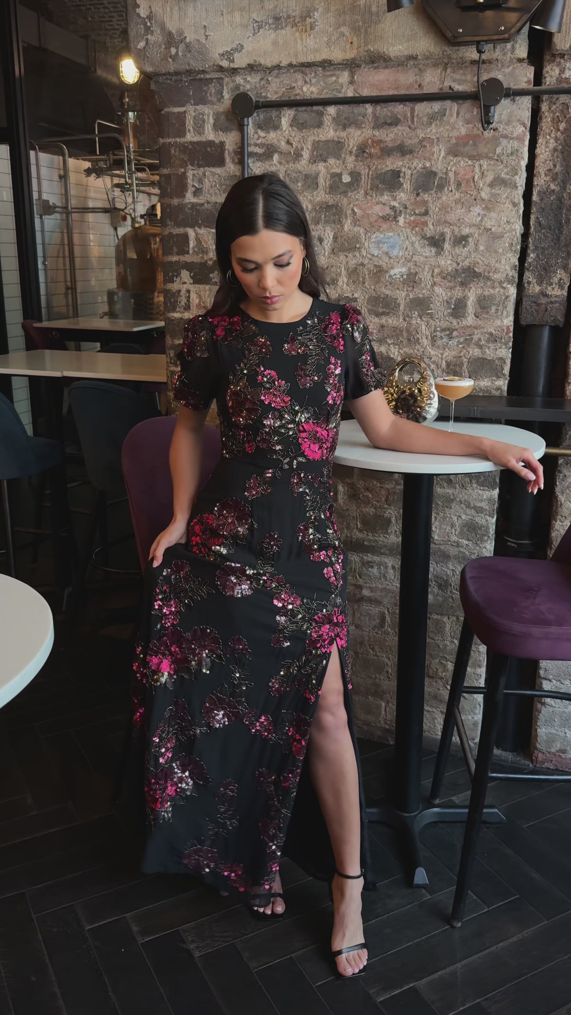 Radiating opulence and artistry, this black maxi dress is a captivating choice for your next event. Lavishly adorned with floral motifs from shoulders to hem, each detail is meticulously hand-sewn with vibrant pink and gold sequins and beads. The round neckline and gently puffed short sleeves lend a demure charm, perfectly balancing the striking keyhole back, which is elegantly finished with delicate self-tie ribbons. A flowing A-line silhouette is elevated by a thigh-high split, adding a touch of allure to this masterfully crafted piece. Style it with gold strappy heels and minimal jewellery for refined look or make a bold statement with pink heels and floral earrings.