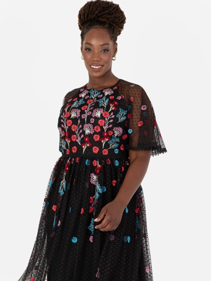 Maya Black Floral Embroidered Spot Mesh Maxi Dress