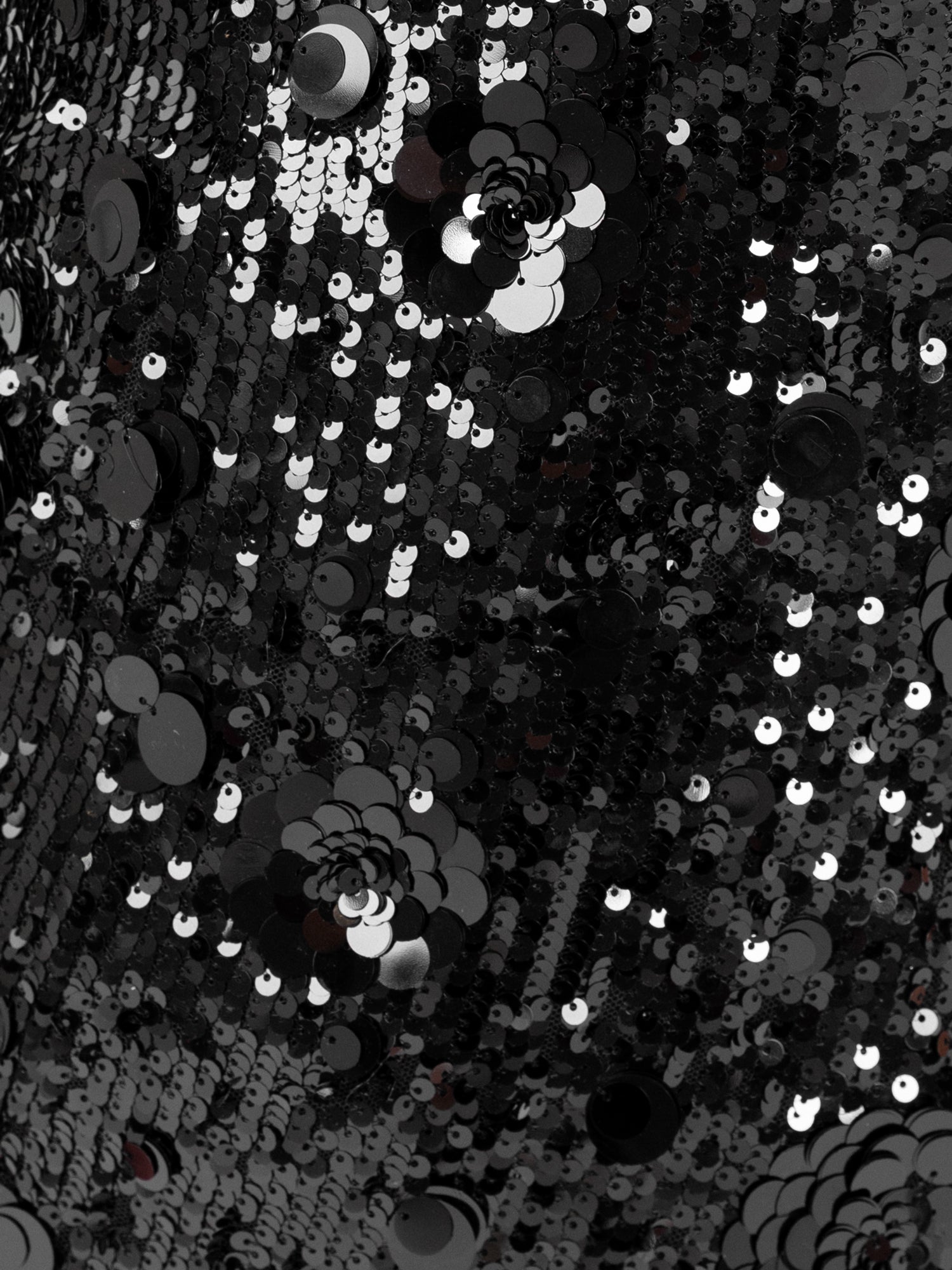 Step into the spotlight with this statement black sequin dress, designed to dazzle from every angle. Adorned with shimmering sequins, 3D floral accents, and bold sequin motifs, it brings dramatic texture and depth for an unforgettable look. The halter neckline is secured with delicate self-tie straps and finished with a matching flower corsage for a romantic touch. Cut in a flattering bodycon silhouette with a cinched waist, the dress sculpts your curves, while a thigh-high split adds comfort and a sultry edge. The ultimate party piece for those who love to stand out, just add bold earrings and statement heels.