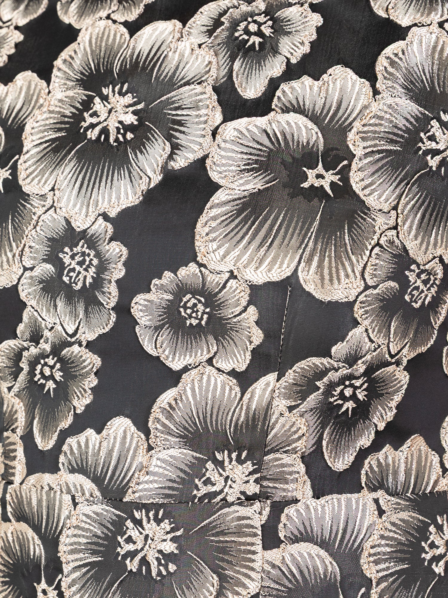 A poised expression of contemporary femininity, this bodycon mini dress is defined by its sculpted silhouette and intricate craftsmanship. Rendered in a textured jacquard weave, the black base is adorned with metallic gold floral designs, some petals subtly raised to create a tactile 3D effect that offers depth and opulence. A round neckline and short puffed sleeves lend a romantic balance to the form-fitting cut, while the reverse reveals an understated, yet alluring keyhole detail fastened with a dainty button and loop. Style with subtle heels and minimalist accessories to let its radiant textures take centre stage.