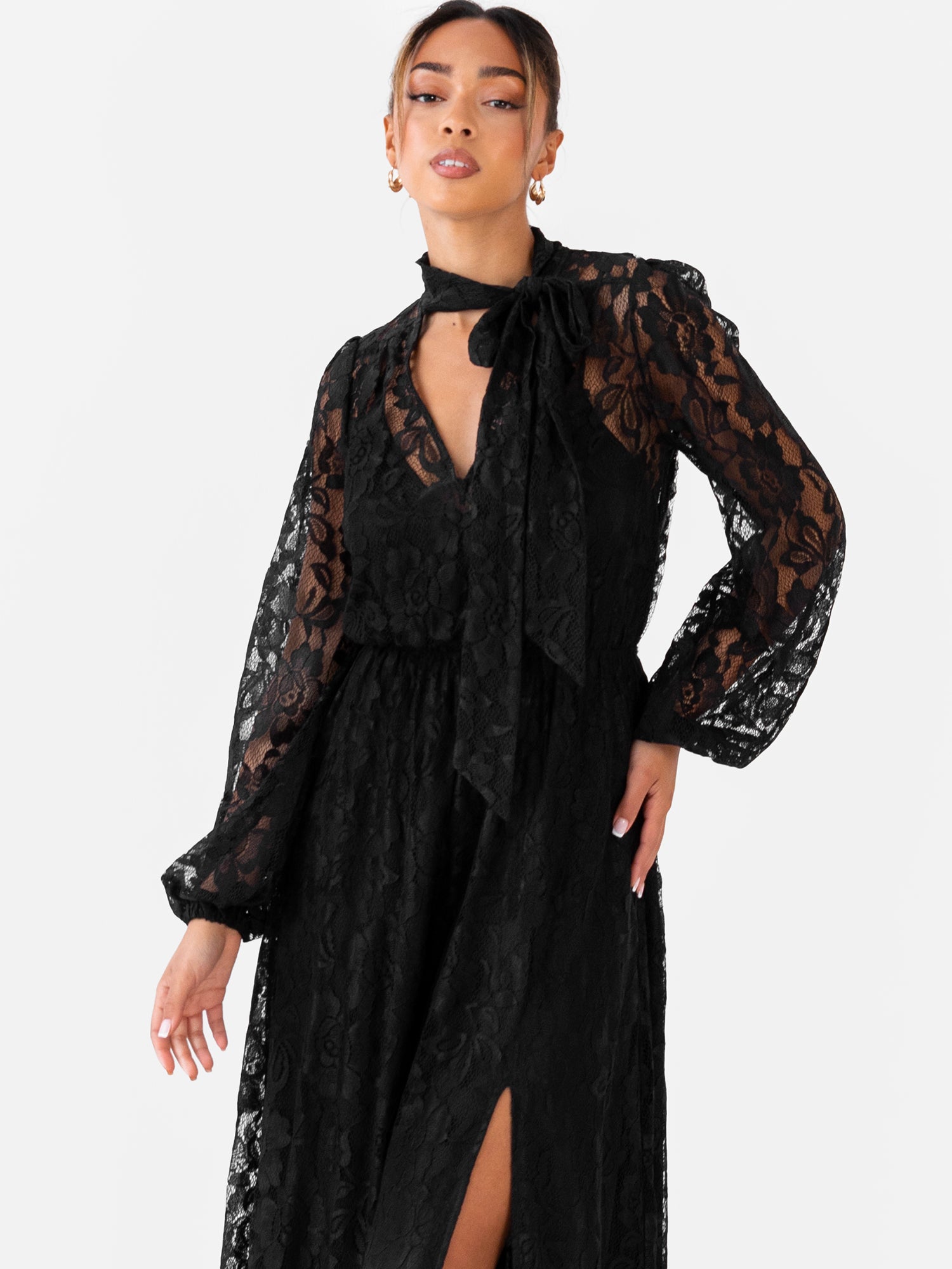 Maya Black Tie Neck Long Sleeve Lace Maxi Dress