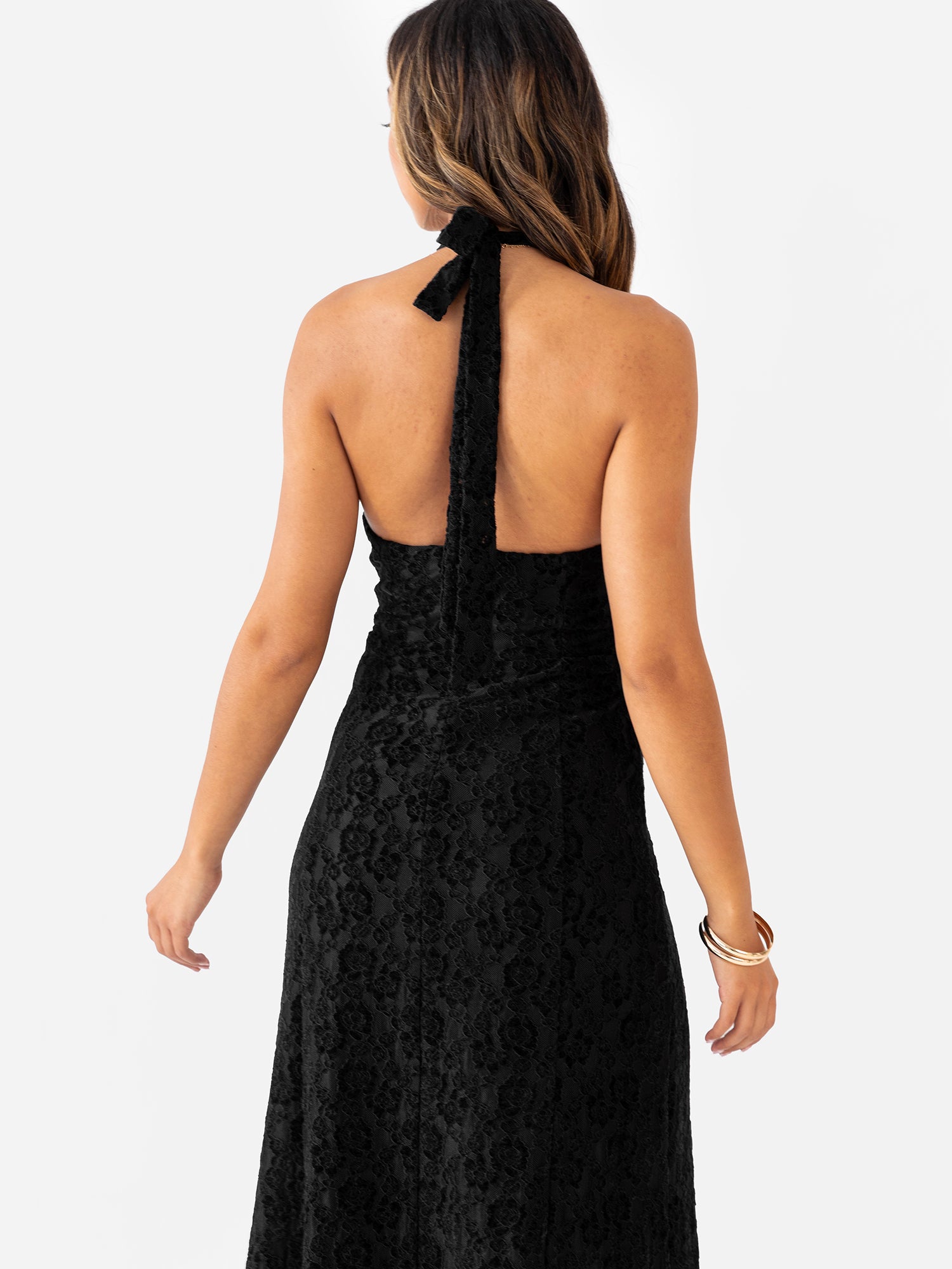 Maya Black Velvet Jacquard Halter Neck Maxi Dress