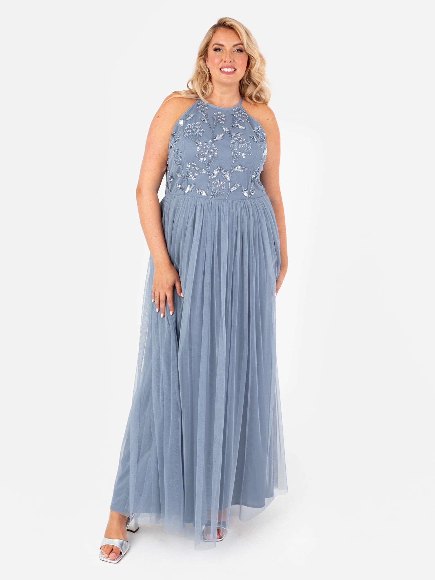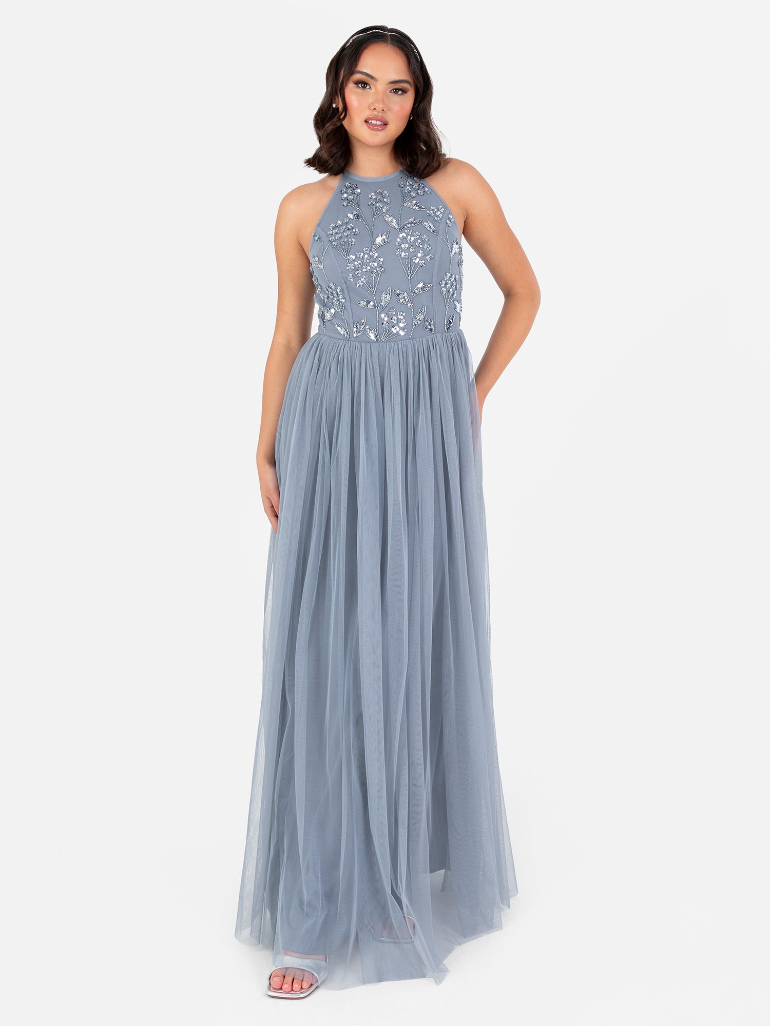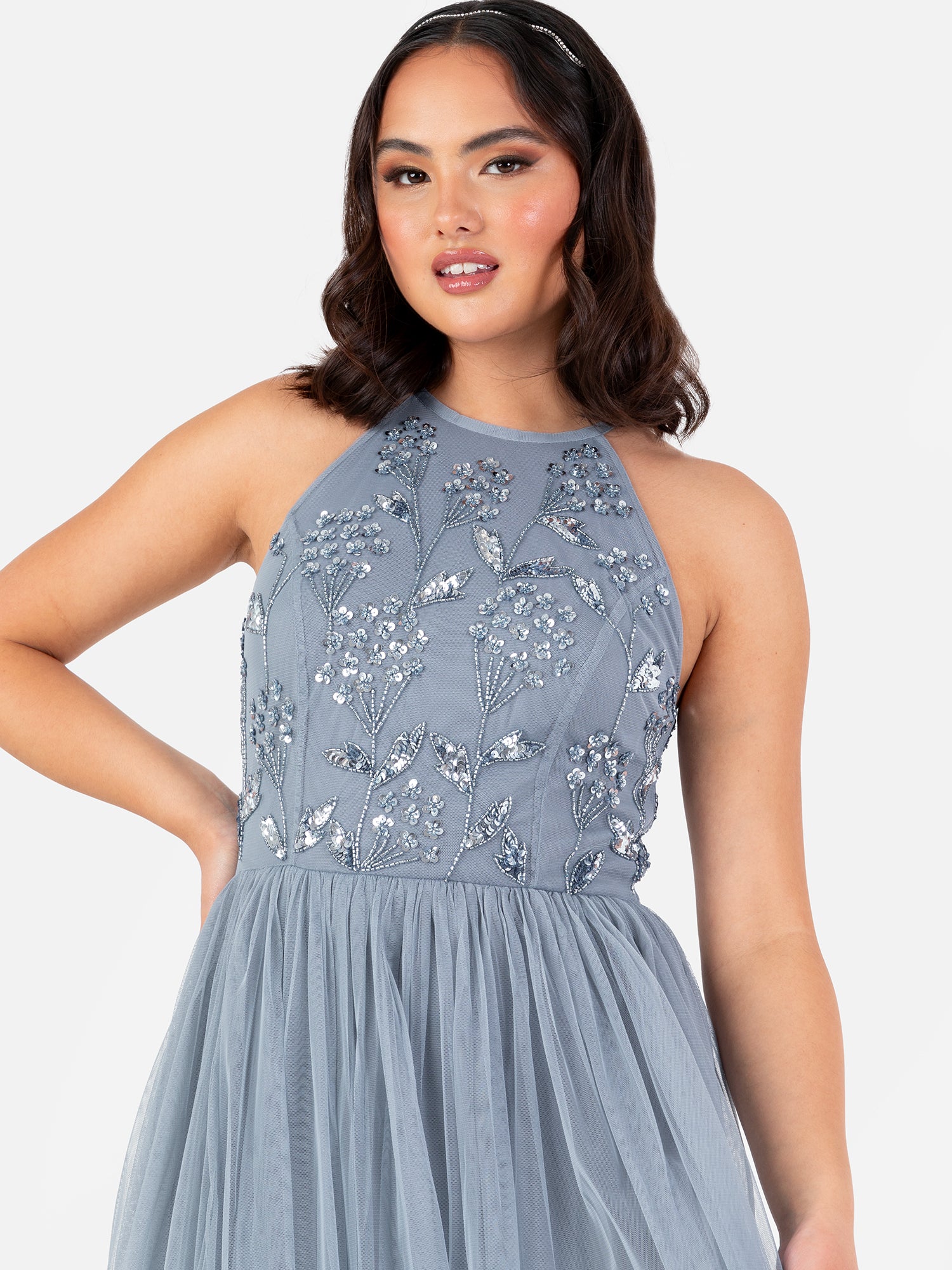Maya Dusty Blue Floral Embellished Halter Neck Maxi Dress