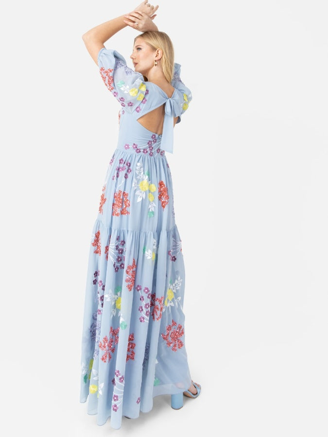 Upgrade your summer events repertoire with this floral maxi. Crafted on a summery blue base the A-line silhouette of this maxi is elevated by the mesmerising floral embroidery and sequin embellishment that runs from the puffed short sleeves and cupped bodice down to the thigh split skirt. Side slip on the skirt adds plenty of movement so you can stroll through the event with style. Pair this open back piece with boldly coloured platform heels to further define the summer look.