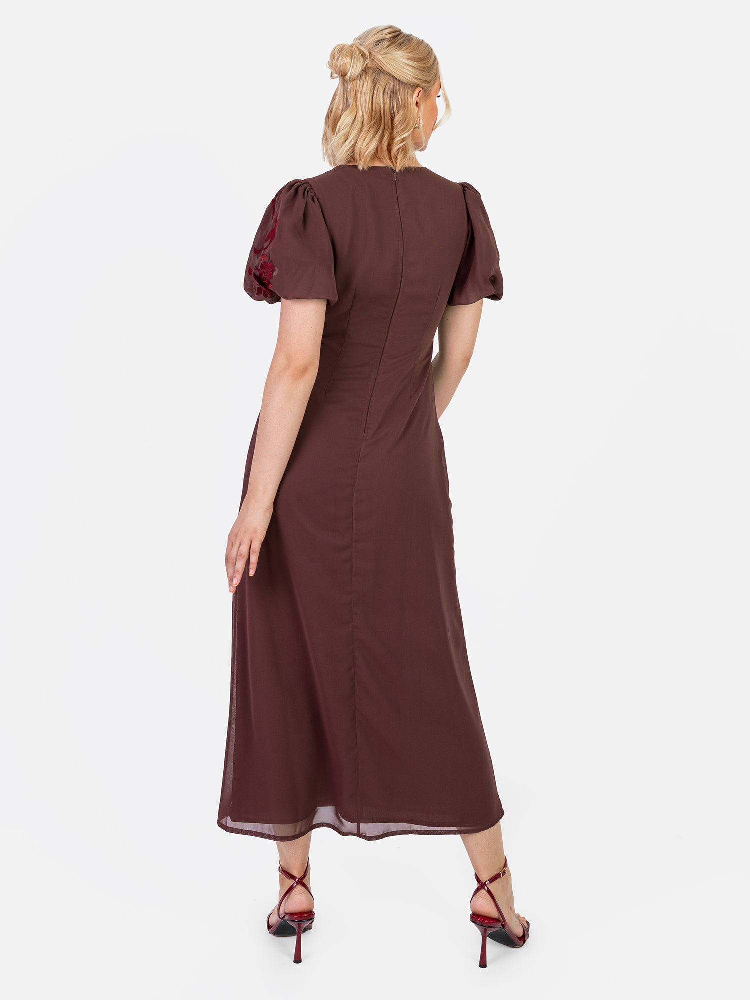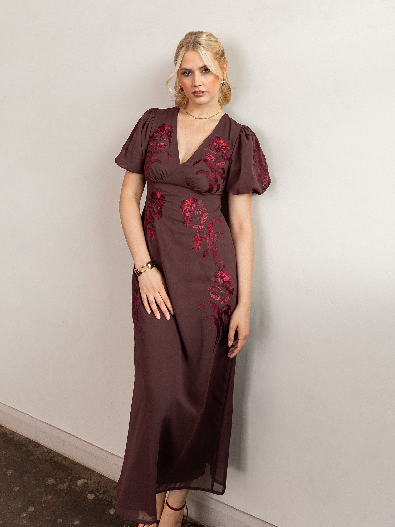 Exuding refined femininity, this ankle-length dress is crafted from lightweight chiffon, lending fluidity to its romantic silhouette. The design features a flattering V-neckline, puffed short sleeves, and an empire waist that gently shapes the bust with a softly gathered bodice. Intricate mirrored floral embroidery in rich red tones contrasts beautifully against the warm brown backdrop, enhancing its timeless allure. Finished with a flowing A-line skirt, it makes an elegant choice for special occasions. Style with black heels and gold jewellery for a polished ensemble.