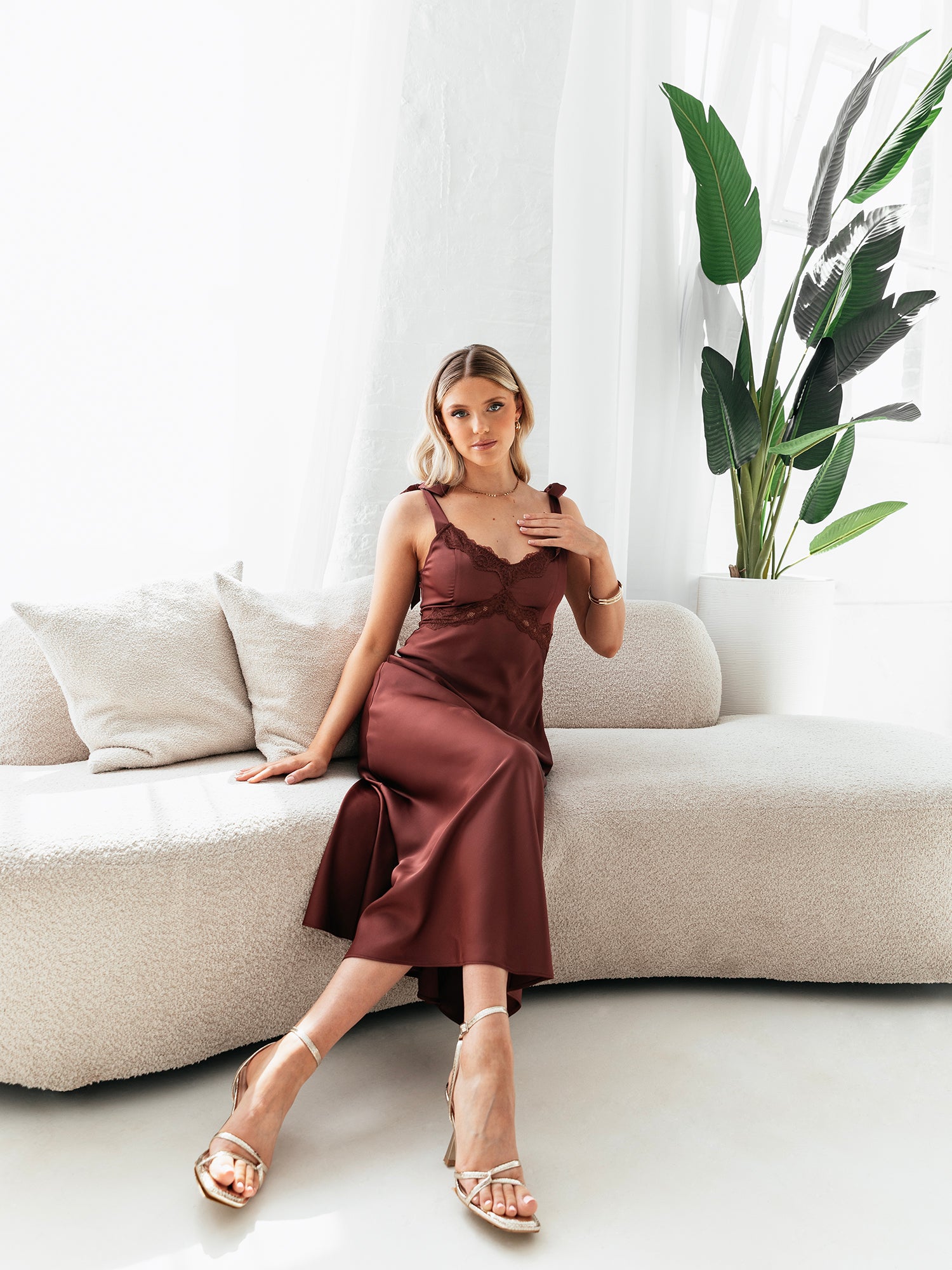 Maya Brown Tie-Shoulder Strappy Satin Midaxi Dress