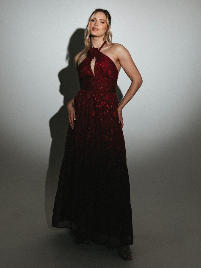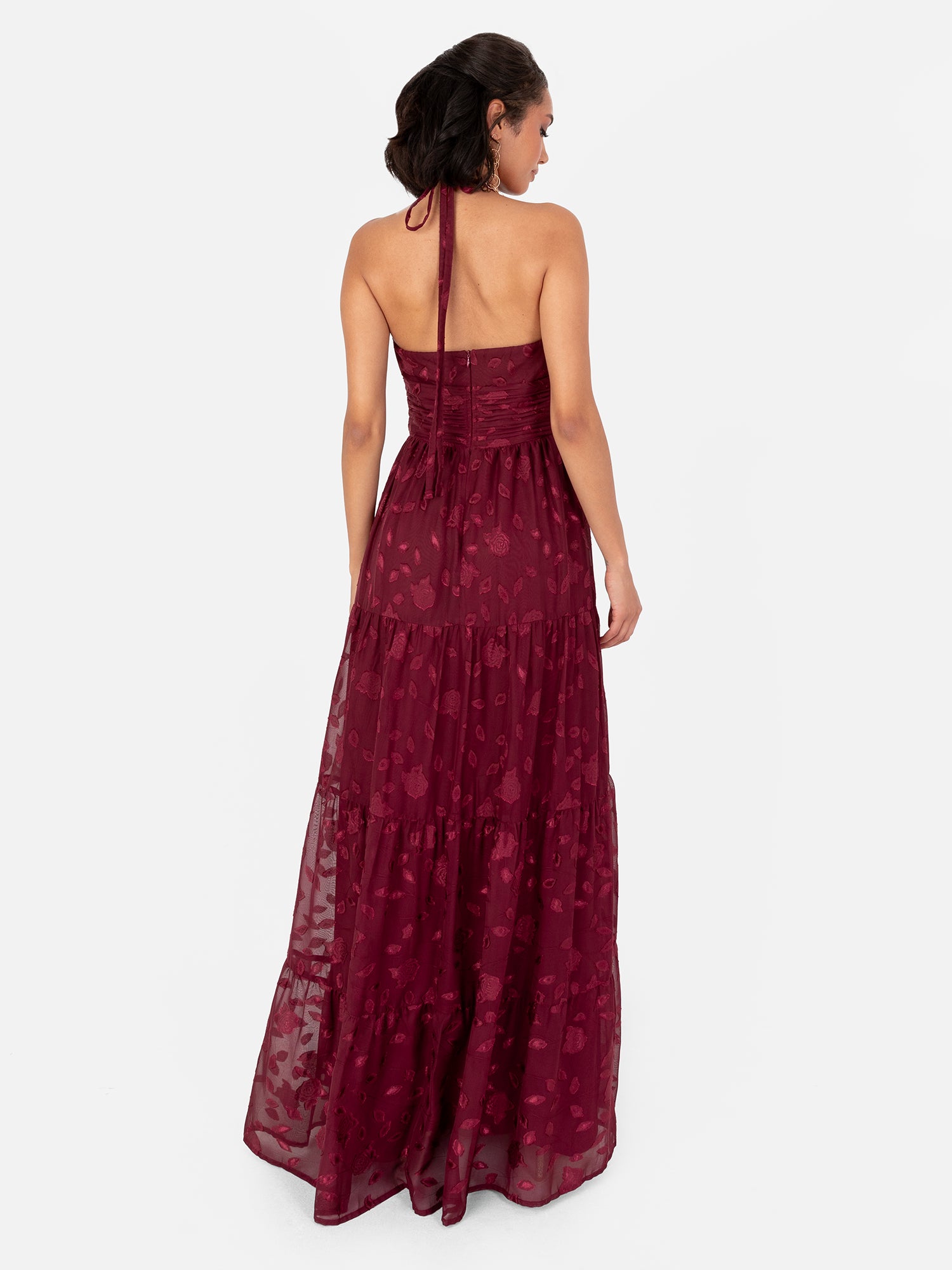Maya Burgundy Corsage Halter Floral Maxi Dress