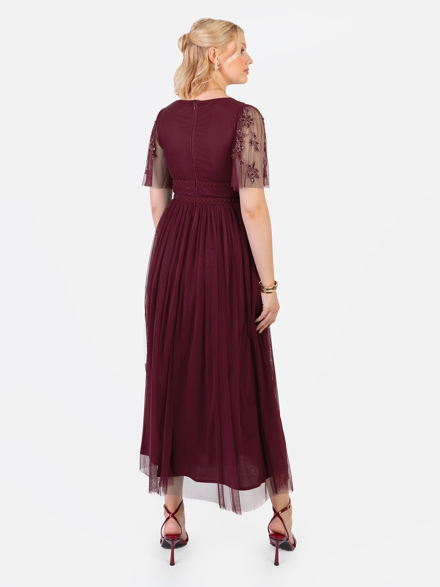 Maya Cranberry Embellished Angel Sleeve & Open Back Midaxi Dress