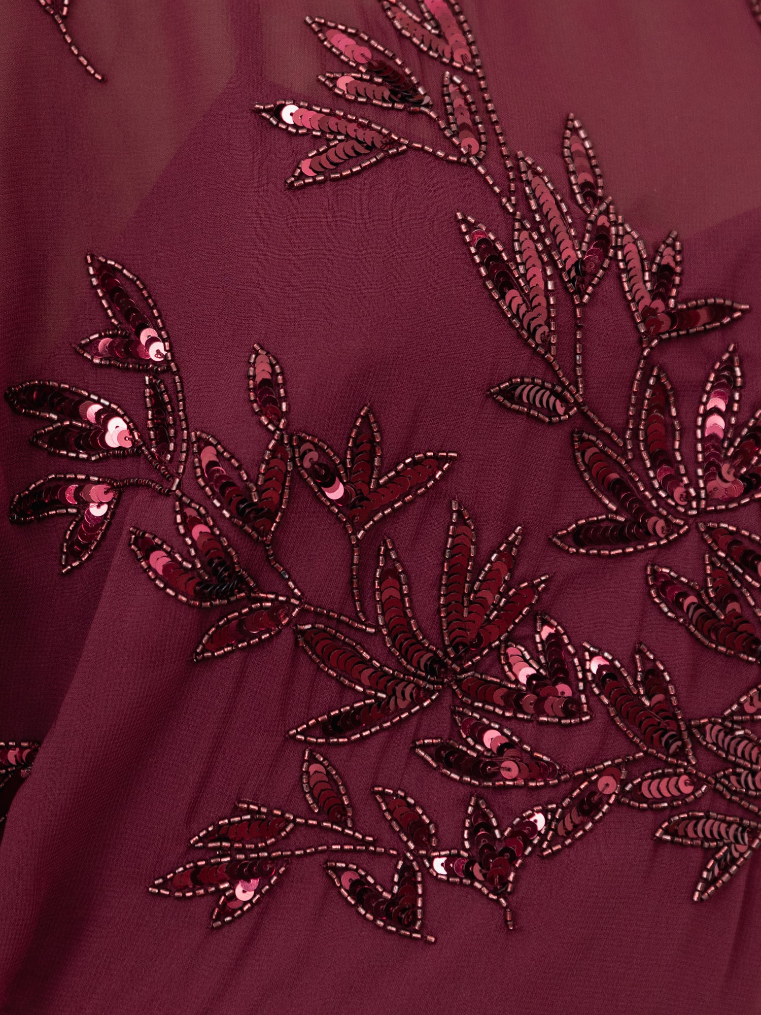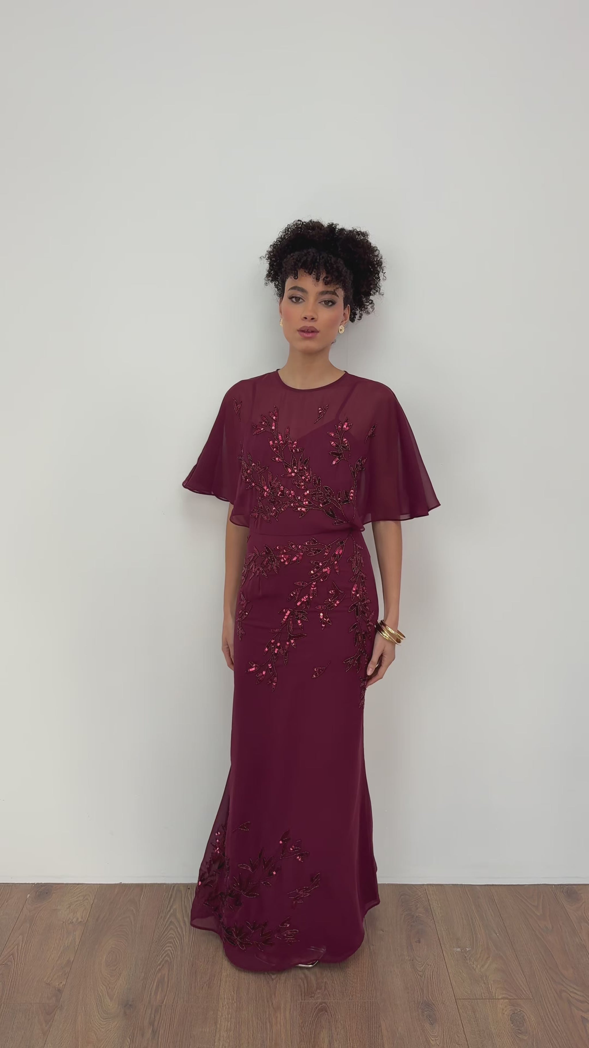 This cranberry floral gown showcases Maya's signature embellishment and timeless silhouette. Featuring a flattering round neckline the sheer angel-sleeve bodice is layered over a strappy lining for a seamless elegant finish. Hand-sewn floral motifs embellished with shimmering sequins and beads adorn the entire dress adding a sophisticated eye-catching touch. Complete the look with strappy heels and minimal jewellery for a truly unforgettable ensemble.