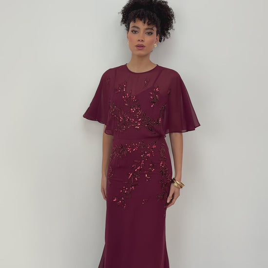 Maya Cranberry Floral Embellished Angel Sleeve Maxi Dress